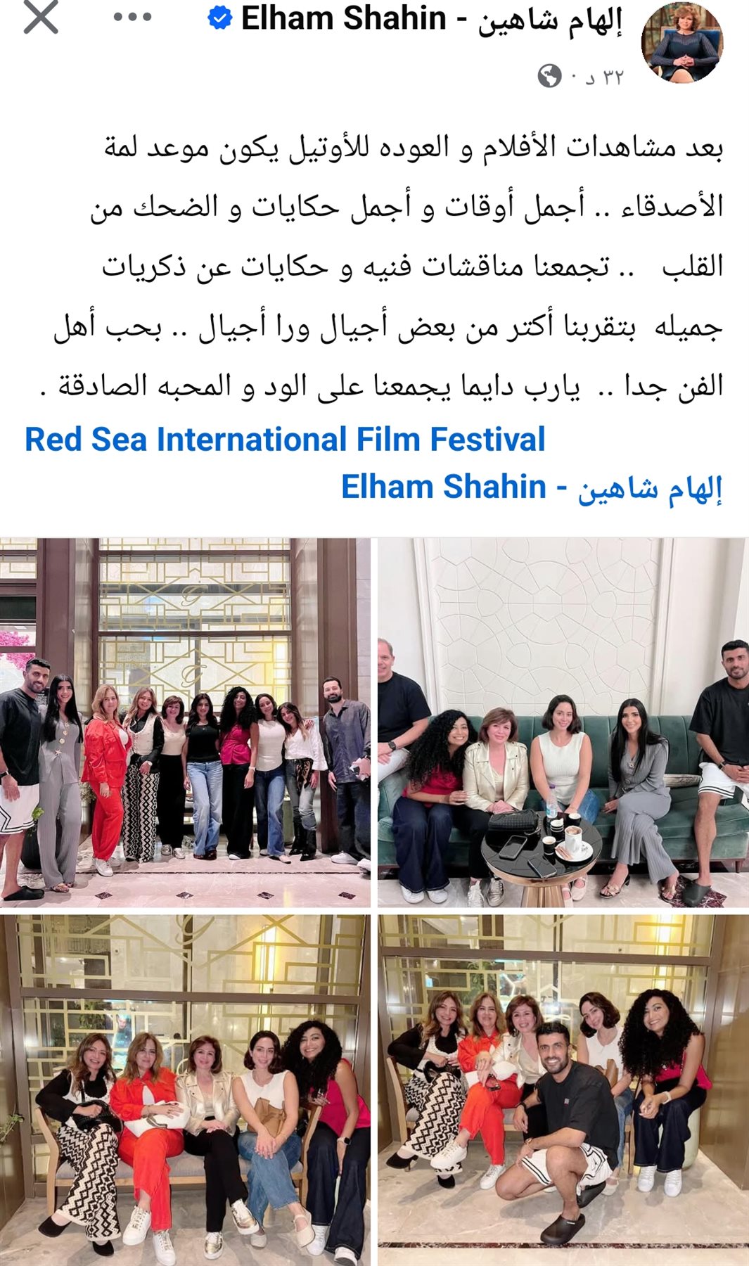 شاركت النجمة إلهام شاهين جمهورها ومتابعيها، بمجموعة صور لها مع مجموعة من نجوم الفن، خلال فعاليات مهرجان البحر الأحمر السينمائي الدولي.