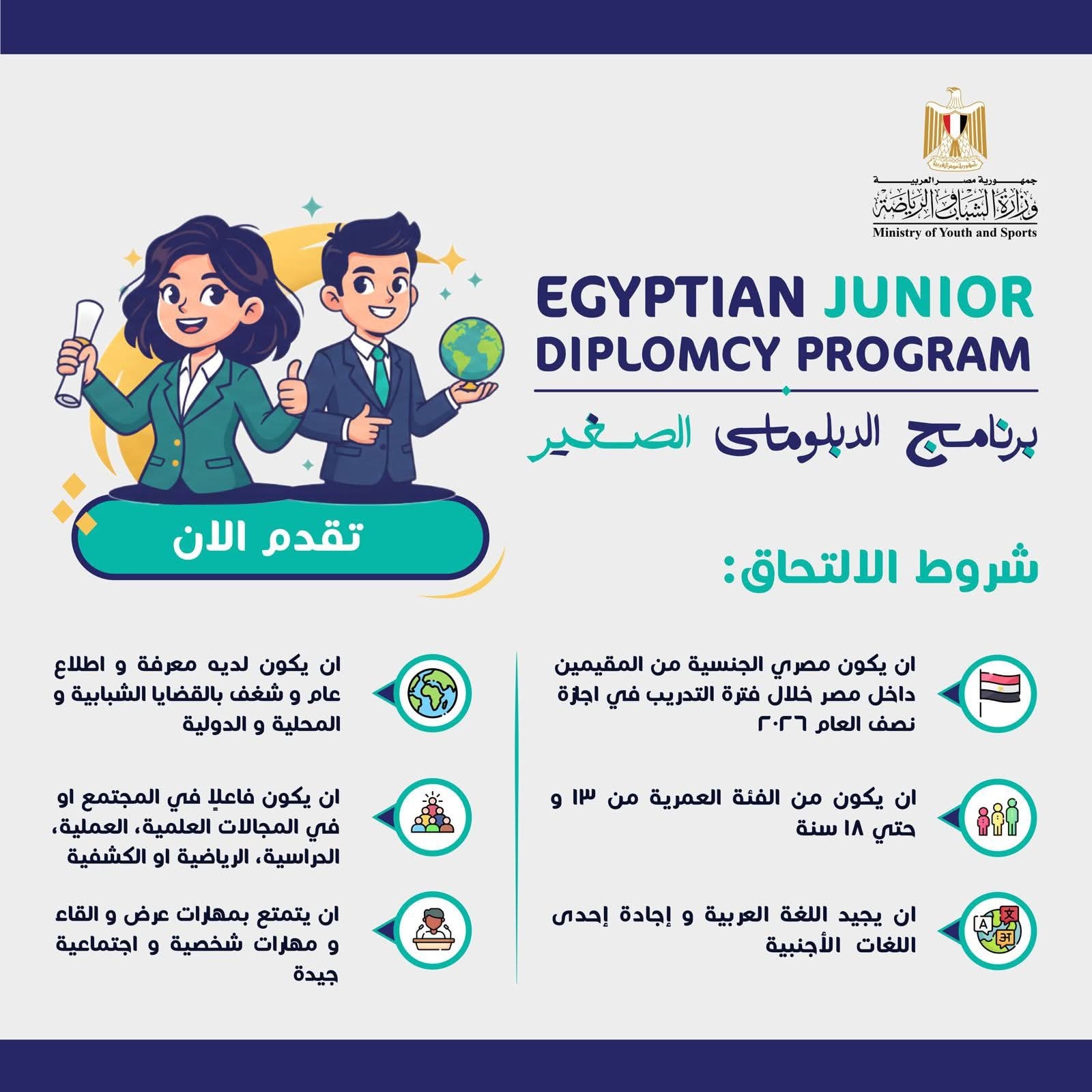 أطلقت وزارة الشباب والرياضة برنامج "الدبلوماسي الصغير"، كأول برنامج من نوعه في مصر الموجَّه إلى النشء بهدف تأهيلهم للمشاركات الدولية وتعزيز وعيهم بالقضايا العالمية، وذلك ضمن إطار عمل برنامج الدبلوماسية الشبابية والرياضية وجهود الدولة في بناء جيل واعٍ قادر على التفاعل مع المتغيرات الدولية بثقة ومعرفة.