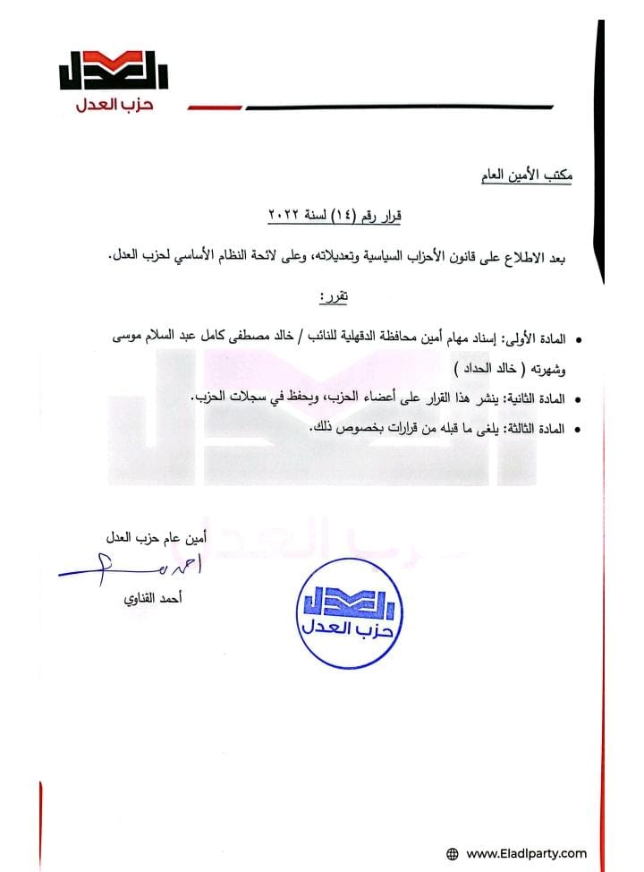 النائب خالد الحداد أمينا لحزب العدل في محافظة الدقهلية