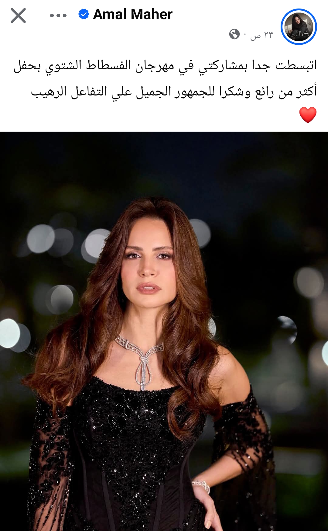 ونشرت آمال ماهر، صورة لها من حفلها بمهرجان الفسطاط الشتوي، عبر حسابها الشخصي بموقع التواصل الاجتماعي فيسبوك.