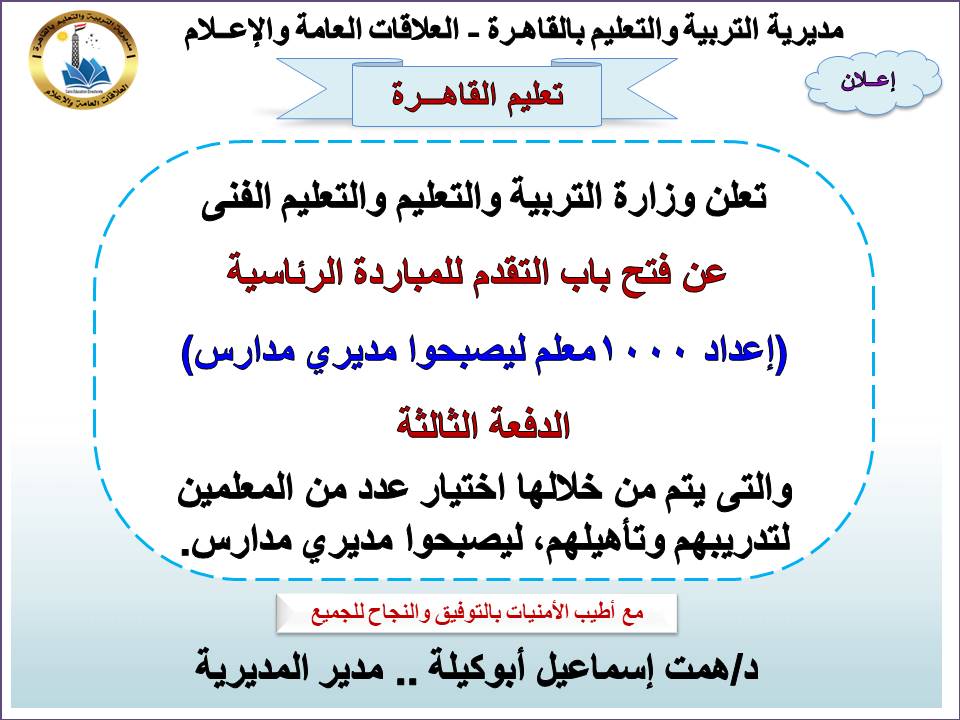 أعلنت مديرية التربية والتعليم بالقاهرة، برعاية الدكتورة همت إسماعيل أبو كيلة مدير المديرية، فتح باب التقدم للدفعة الثالثة من المبادرة الرئاسية لإعداد (1000) معلم لتولي مهام مدير مدرسة، وذلك تنفيذًا لتعليمات وزارة التربية والتعليم والتعليم الفني في إطار دعم وتأهيل القيادات المدرسية القادرة على إحداث تطوير نوعي في المنظومة التعليمية.