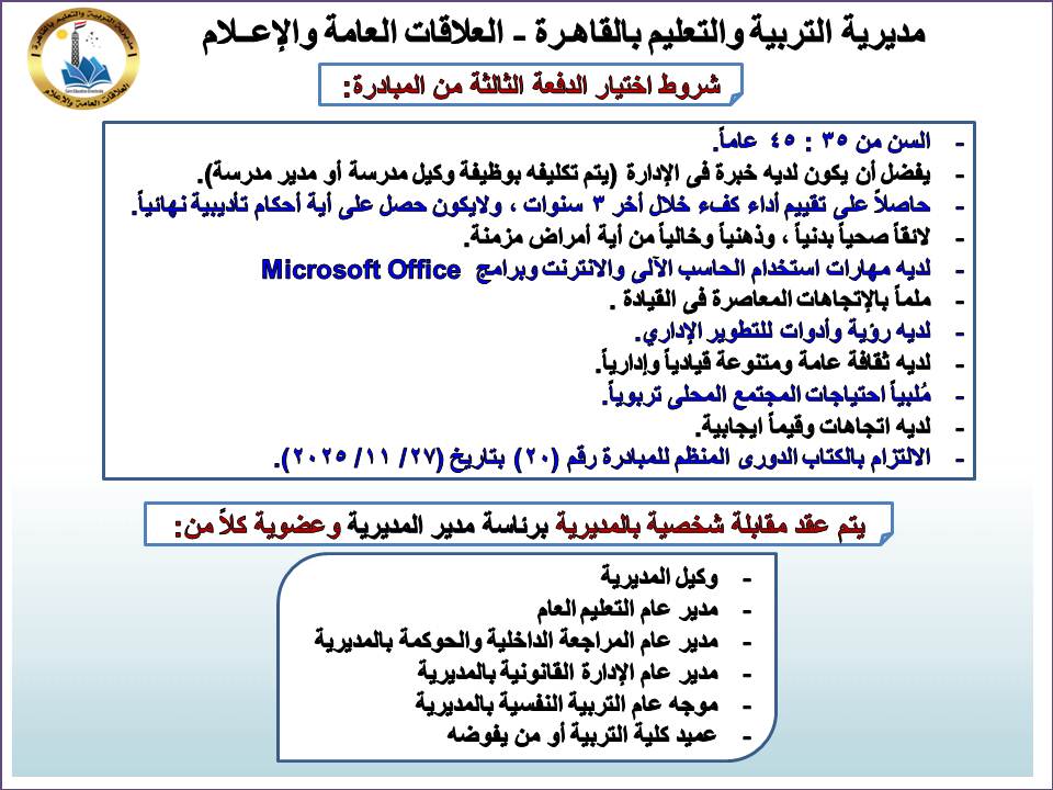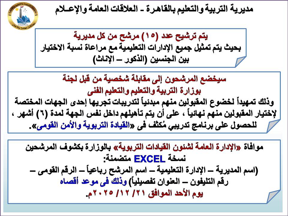 تؤكد المديرية ضرورة إرسال كشوف المرشحين إلى الإدارة العامة لشئون القيادات التربوية بالوزارة في ملف Excel يشمل:(اسم المديرية – الإدارة التعليمية – الاسم رباعيًا – الرقم القومي – رقم الهاتف – العنوان التفصيلي)، وذلك بحد أقصى الأحد 21 ديسمبر 2025.