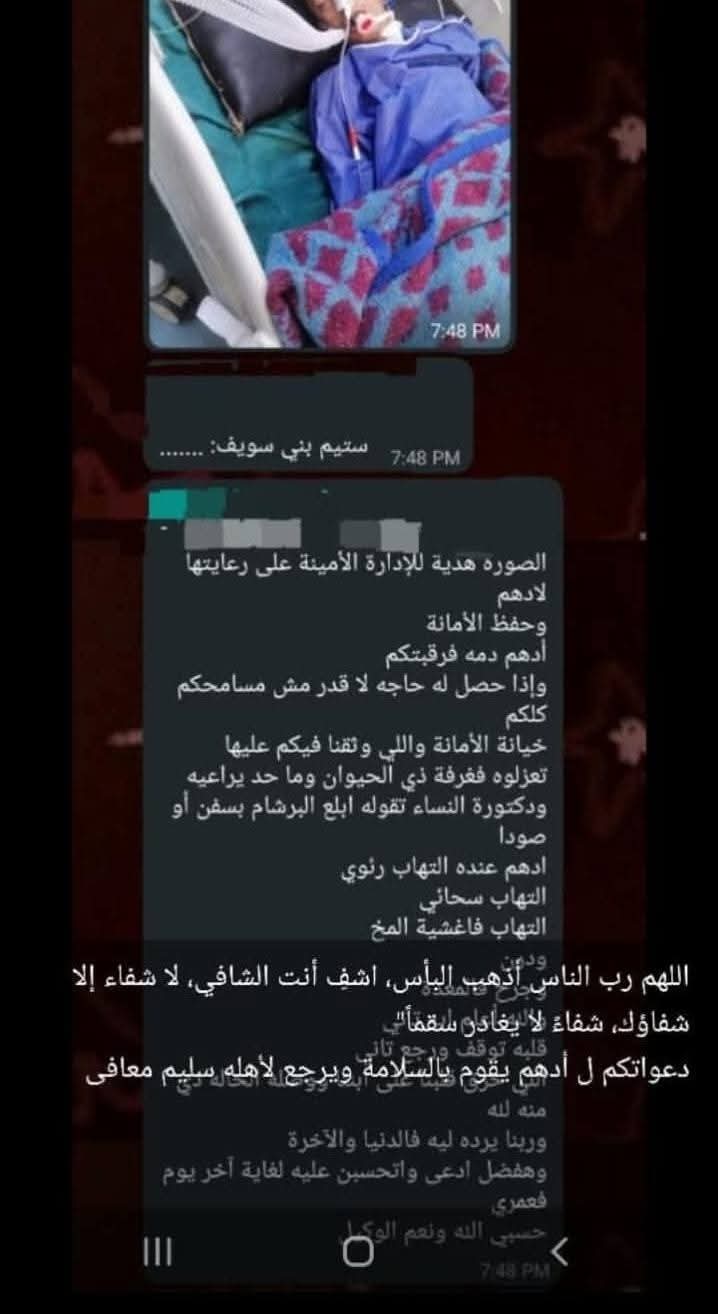 وأشاروا إلى أن المدرسة قامت بعزل الطالب في غرفة غير مهيأة لاستقبال الحالات المرضية، دون توفير رعاية طبية كافية أو نقله إلى المستشفى في الوقت المناسب، وهو ما أدى إلى تدهور حالته بصورة خطيرة.
