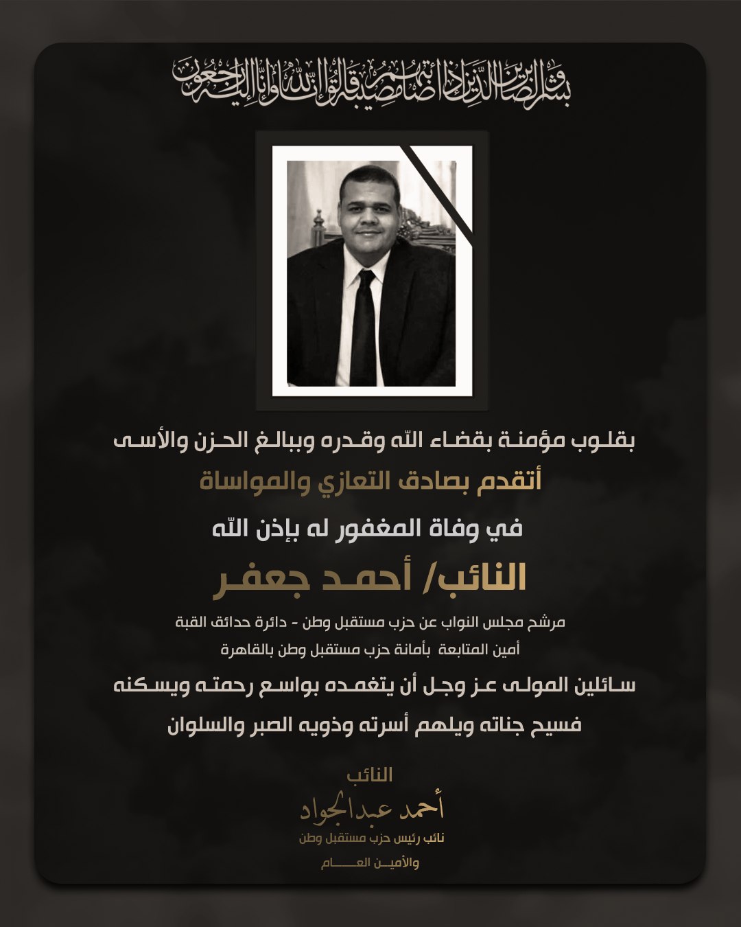 ونعى حزب مستقبل وطن، مرشحه بدائرة حدائق القبة، النائب أحمد جعفر، والذي يخوض جولة الإعادة في انتخابات مجلس النواب 2025.