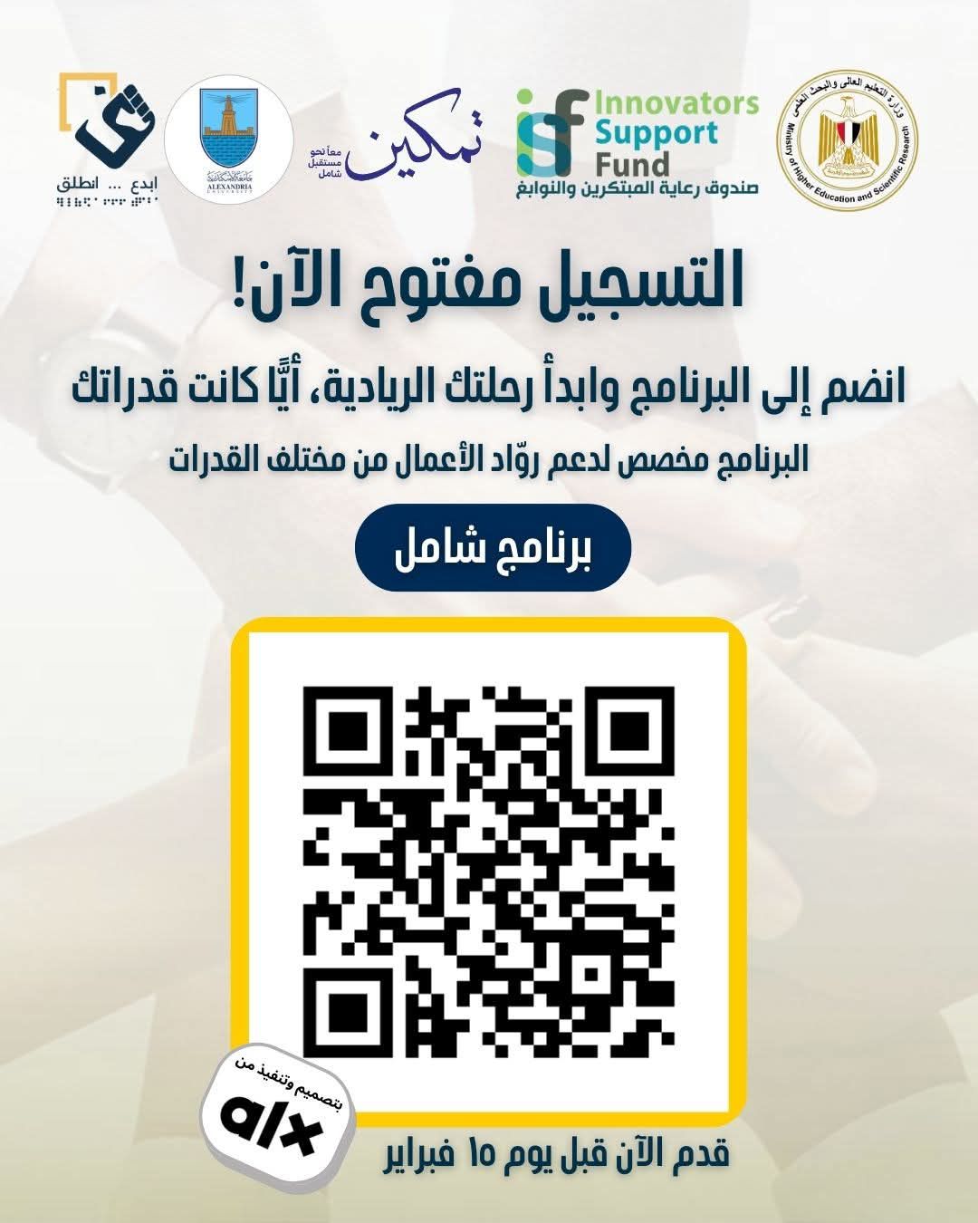 وأشارت جامعة الإسكندرية، إلى أن آخر موعد للتقديم: 15 فبراير، وأن التقديم متاح من خلال جامعة الإسكندرية، وذلك بالشراكة مع وزارة التعليم العالي والبحث العلمي، وصندوق رعاية المبتكرين، ومؤسسة تمكين، ويمكن التقديم من خلال الـQR Code أو الدخول عبر الرابط التالي: هنا
