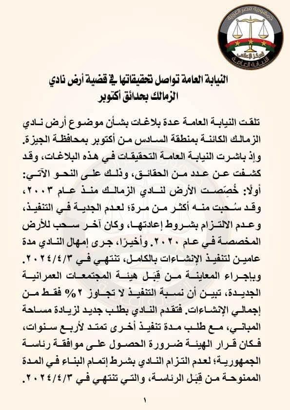 أعلنت النيابة العامة استمرار تحقيقاتها في قضية أرض نادي الزمالك بمنطقة حدائق أكتوبر بمحافظة الجيزة، وذلك عقب تلقيها عدة بلاغات بشأن المخالفات المتعلقة بالأرض المخصصة للنادي منذ عام 2003.