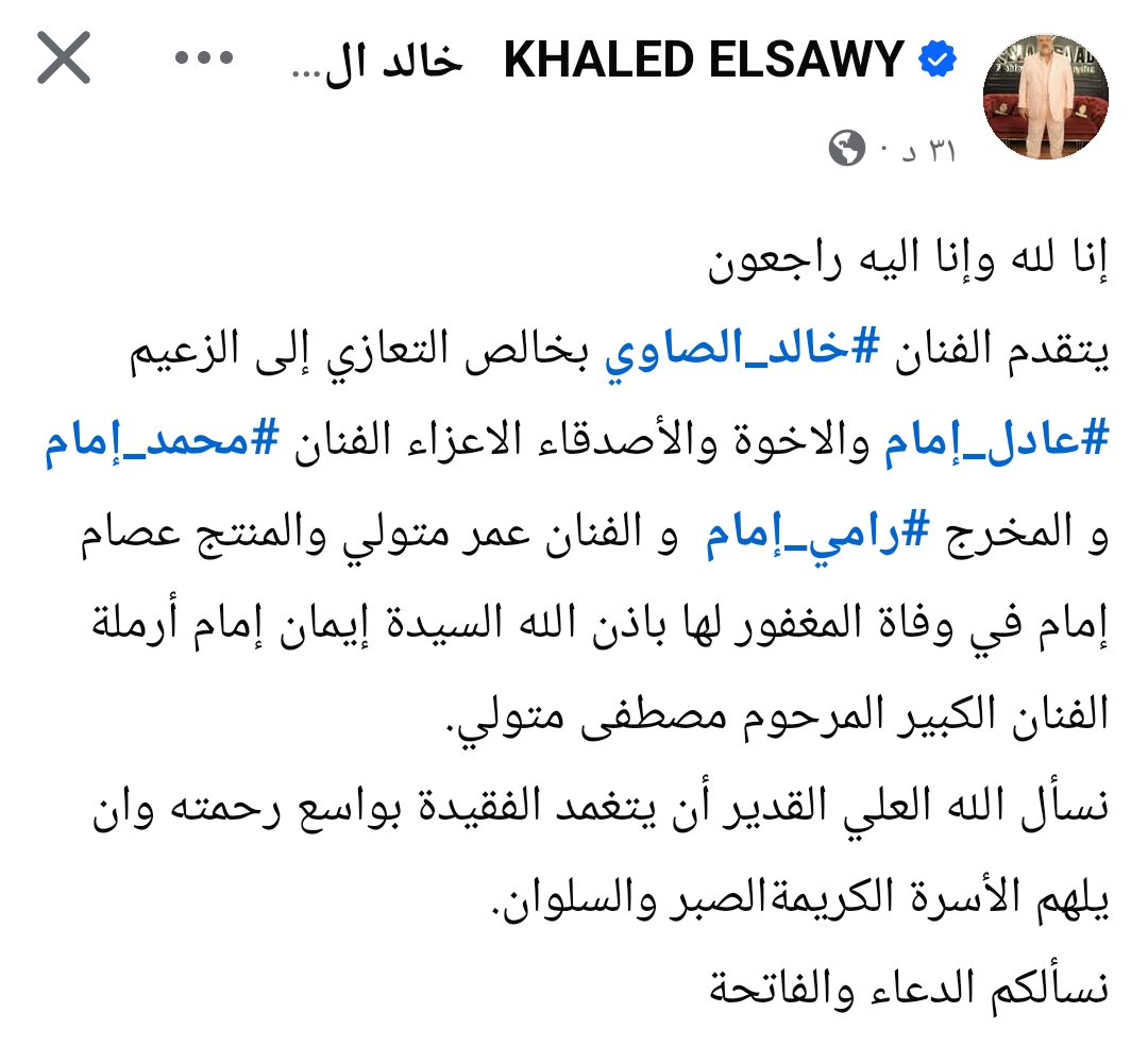يتقدم الفنان خالد الصاوي بخالص التعازي إلى الزعيم عادل إمام والاخوة والأصدقاء الاعزاء، الفنان محمد إمام والمخرج رامي إمام، والفنان عمر متولي والمنتج عصام إمام في وفاة المغفور لها باذن الله السيدة إيمان إمام أرملة الفنان الكبير المرحوم مصطفى متولي".