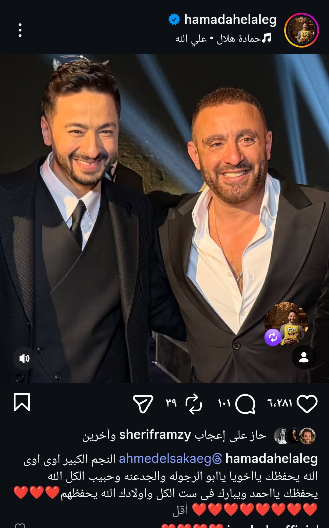 ونشر حمادة هلال صورة تجمعه بالنجم أحمد السقا، عبر حسابه الرسمي بموقع تبادل الصور والفيديوهات الشهير انستجرام، وعلق قائلا: “أحمد السقا، النجم الكبير اوى اوى الله يحفظك يا أخويا يا أبو الرجولة والجدعنة وحبيب الكل”.