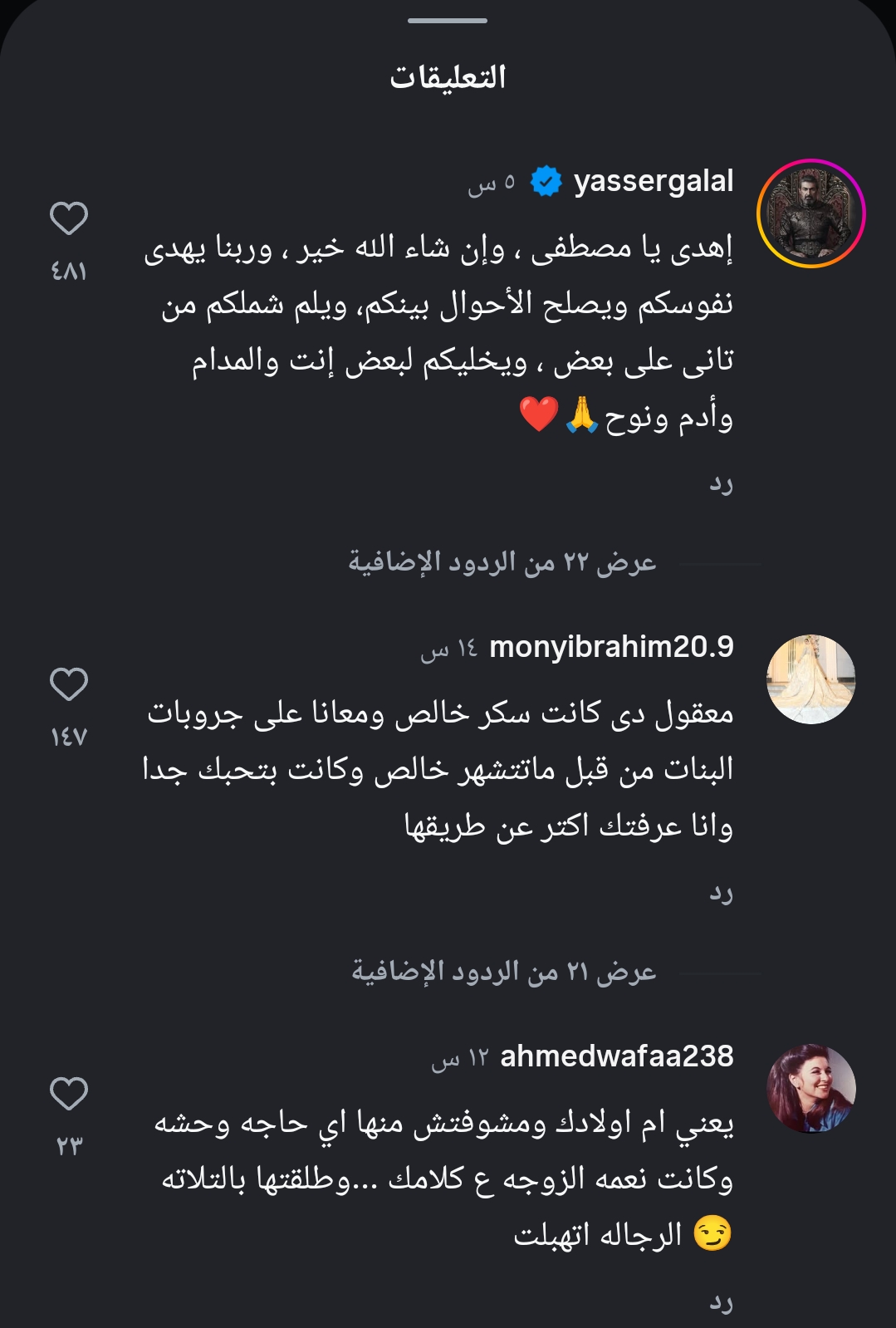 وعلق ياسر جلال، على منشور مصطفى أبو سريع، قائلا: “إهدى يا مصطفى وإن شاء الله خير وربنا يهدي نفوسكم ويصلح الأحوال بينكم.. ويلم شملكم من تاني علي بعض ويخليكم لبعض أنت والمدام وآدم ونوح”.