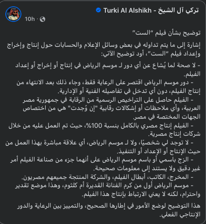 وشدد رئيس هيئة الترفيه على أن فيلم «الست» إنتاج مصري خالص بنسبة 100%، حيث تم تنفيذه من خلال شركات إنتاج مصرية، وبمشاركة مخرج وكاتب وأبطال جميعهم مصريون، مؤكدًا أنه لا توجد له شخصيًا، ولا لموسم الرياض، أي علاقة مباشرة بالفيلم من حيث الإنتاج أو الإعداد أو التنفيذ.