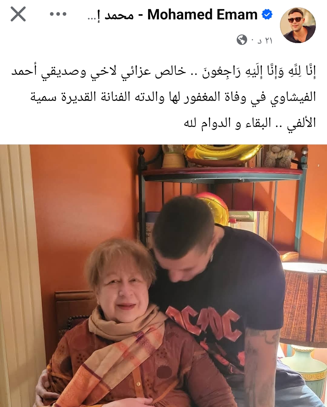 وعلق قائلا: إِنَّا لِلَّهِ وَإِنَّا إِلَيْهِ رَاجِعُونَ.. خالص عزائي لأخي وصديقي أحمد الفيشاوي في وفاة المغفور لها والدته الفنانة القديرة سمية الألفي.. البقاء والدوام لله".