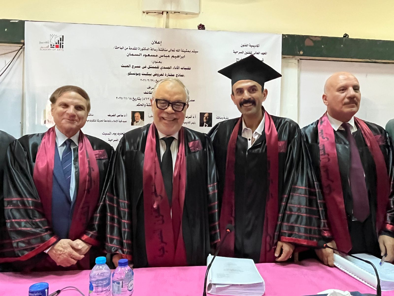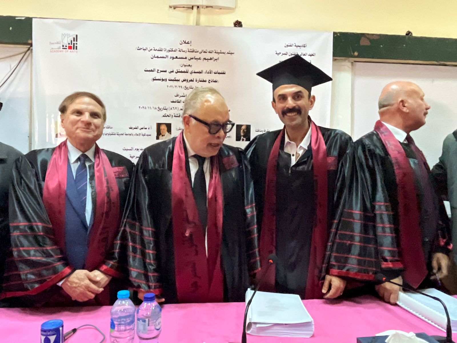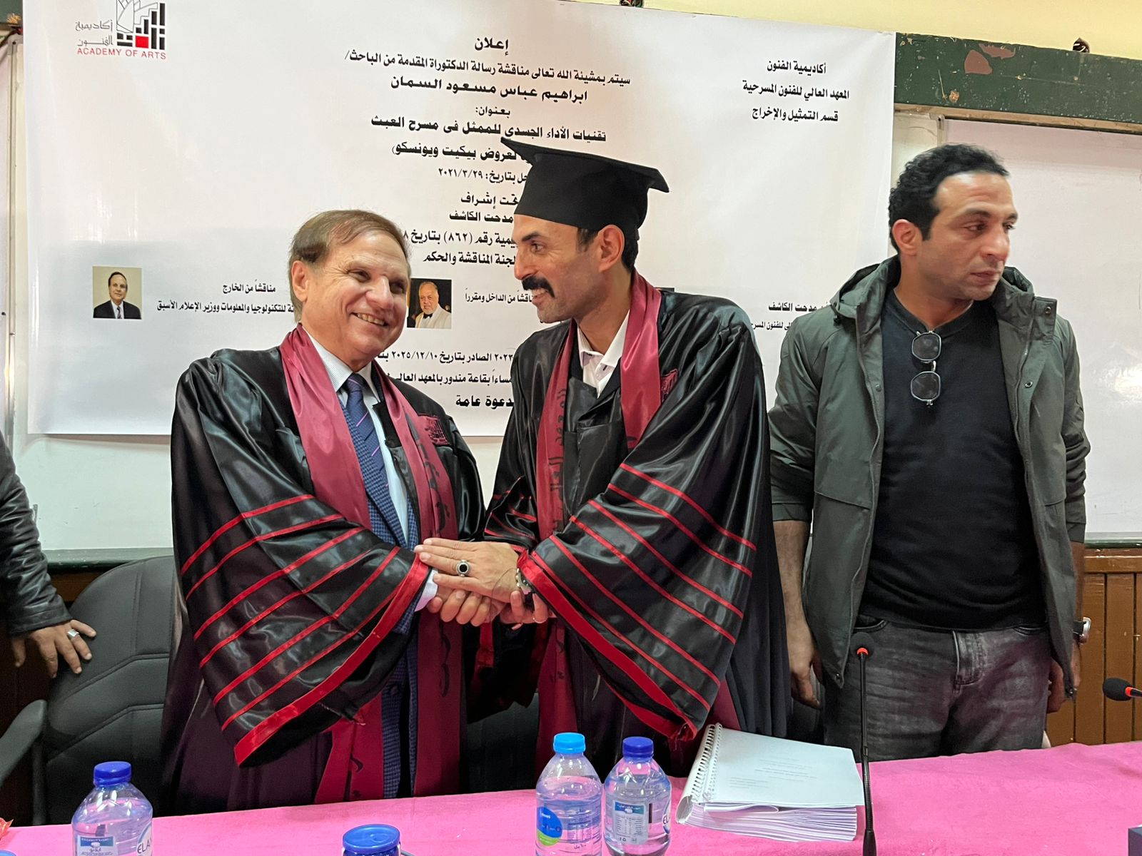 وجاءت رسالة الدكتوراه الخاصة بإبراهيم السمان بعنوان “تقنيات الأداء الجسدي للممثل في مسرح العبث، نماذج مختارة لعروض بيكيت ويونسكو”، حيث تناولت الدراسة تحليلًا معمقًا لآليات الأداء الجسدي وأهميته في التعبير الدرامي داخل مسرح العبث، مع تطبيقات عملية ونماذج تحليلية لعروض عالمية.