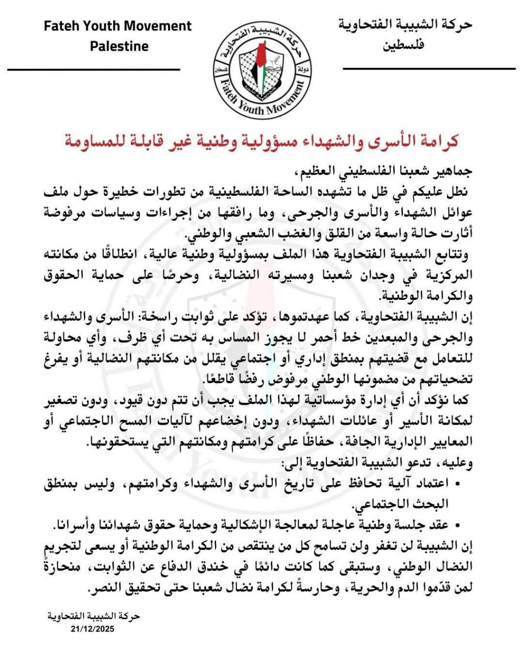 وطالبت حركة الشبيبة الفتحاوية بعقد جلسة وطنية عاجلة لمناقشة هذه الإشكالية ووضع آليات فعالة لحماية حقوق المناضلين، مع التأكيد على أن أي تقصير في هذا المجال يمثل إخلالًا بالواجب الوطني.