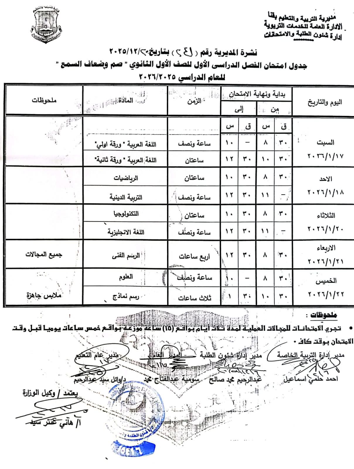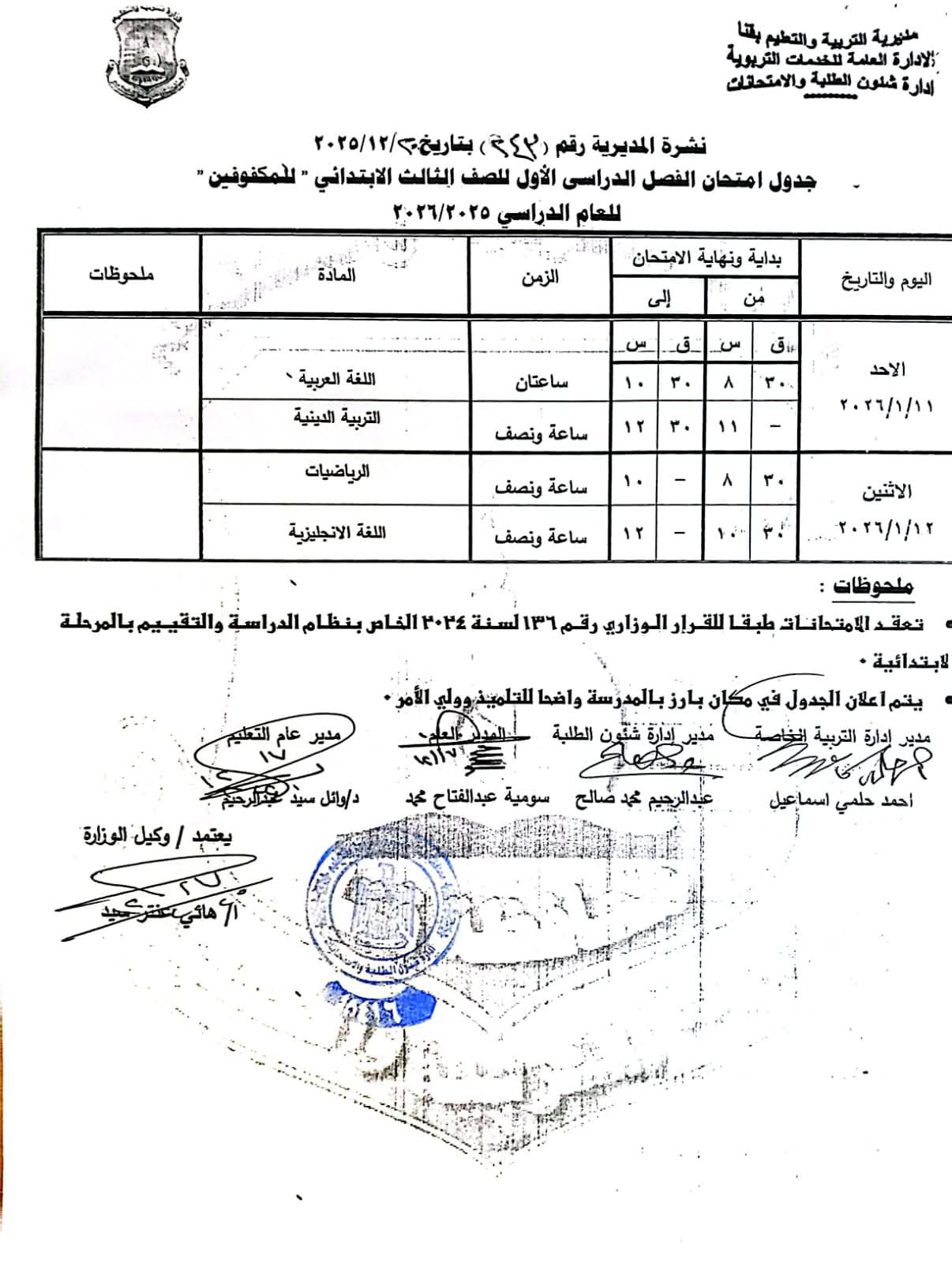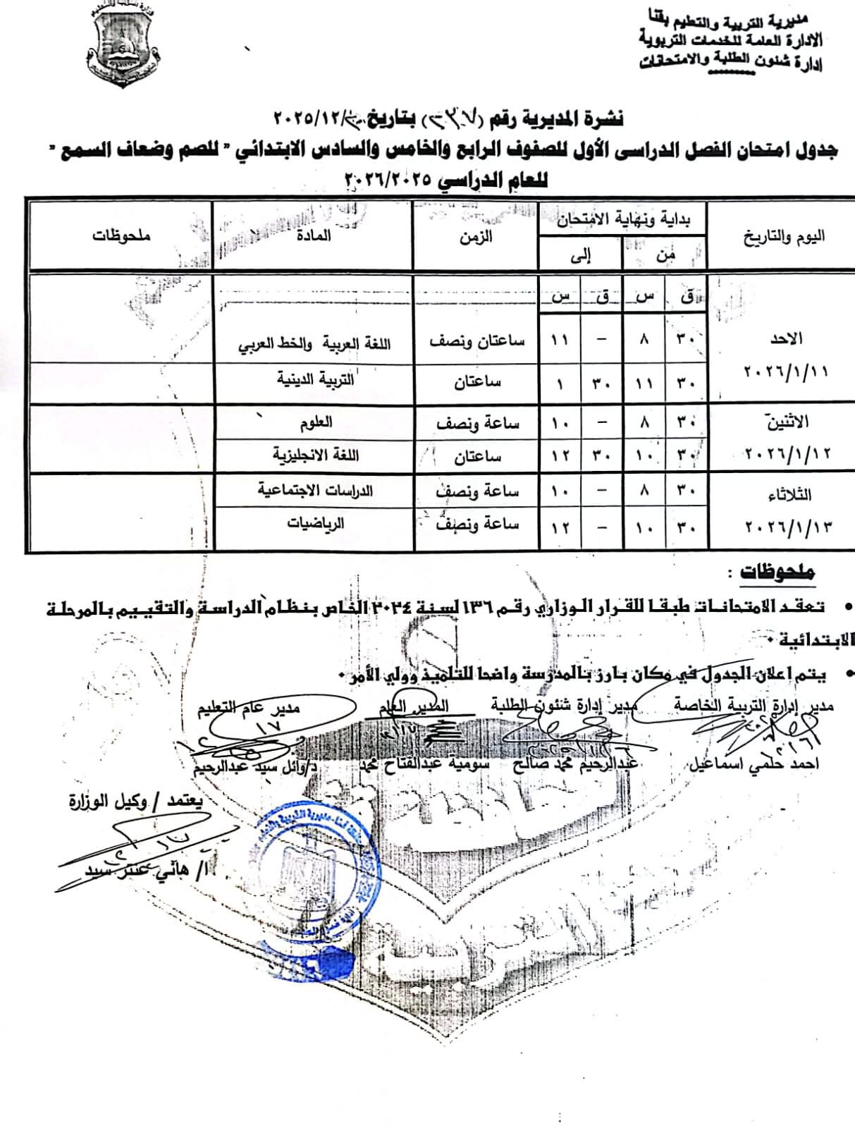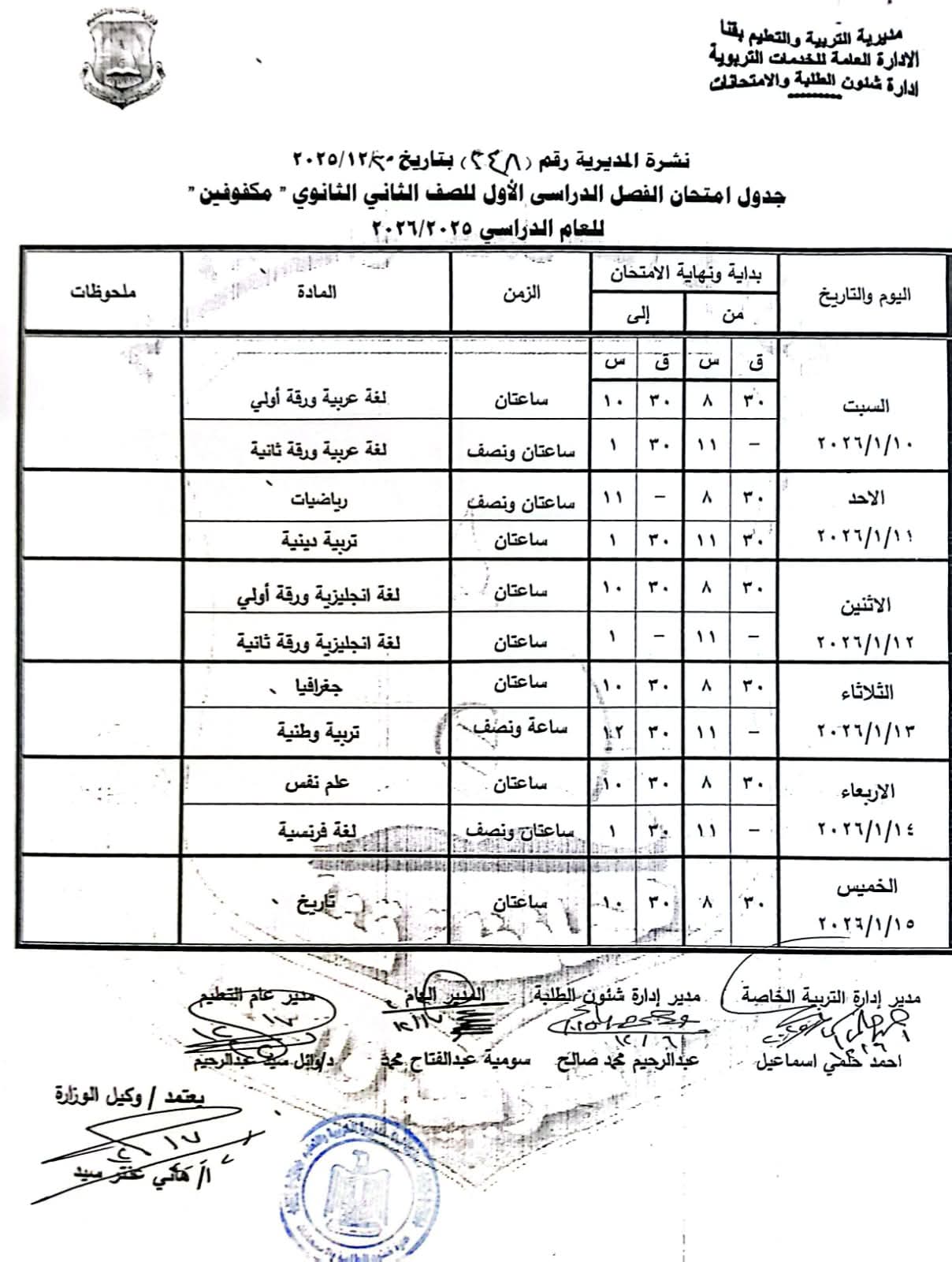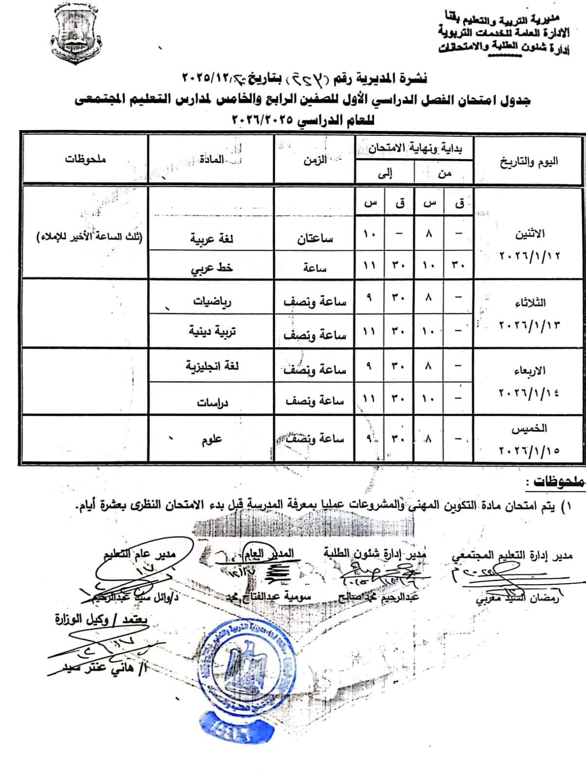 ومن جانبه أوضح محافظ قنا أن امتحانات الصفين الثالث والرابع الابتدائي (عام – رسمي لغات – دمج) ستعقد خلال الفترة من السبت 10 يناير 2026م وحتى الأربعاء 14 يناير 2026م، بينما تبدأ امتحانات الصفين الخامس والسادس الابتدائي (عام – رسمي لغات – دمج) من الأحد 11 يناير 2026م وحتى الخميس 15 يناير 2026م.