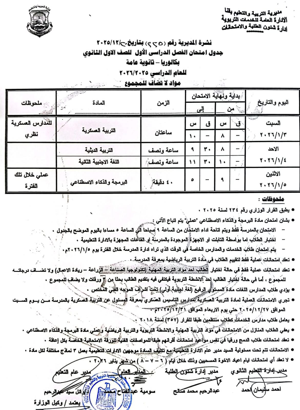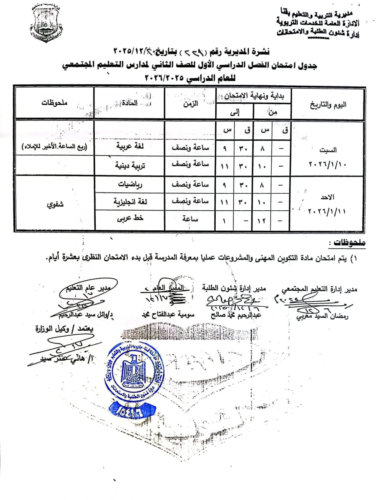 وفي السياق ذاته، أشار محافظ قنا، إلى أن امتحانات الصفين الأول والثاني الإعدادي (عام – رسمي لغات – دمج) ستبدأ اعتبارًا من السبت 10 يناير 2026م وحتى الأربعاء 14 يناير 2026م، كما تقرر عقد امتحانات الصفين الأول والثاني الإعدادي المهني والدمج خلال الفترة نفسها.
