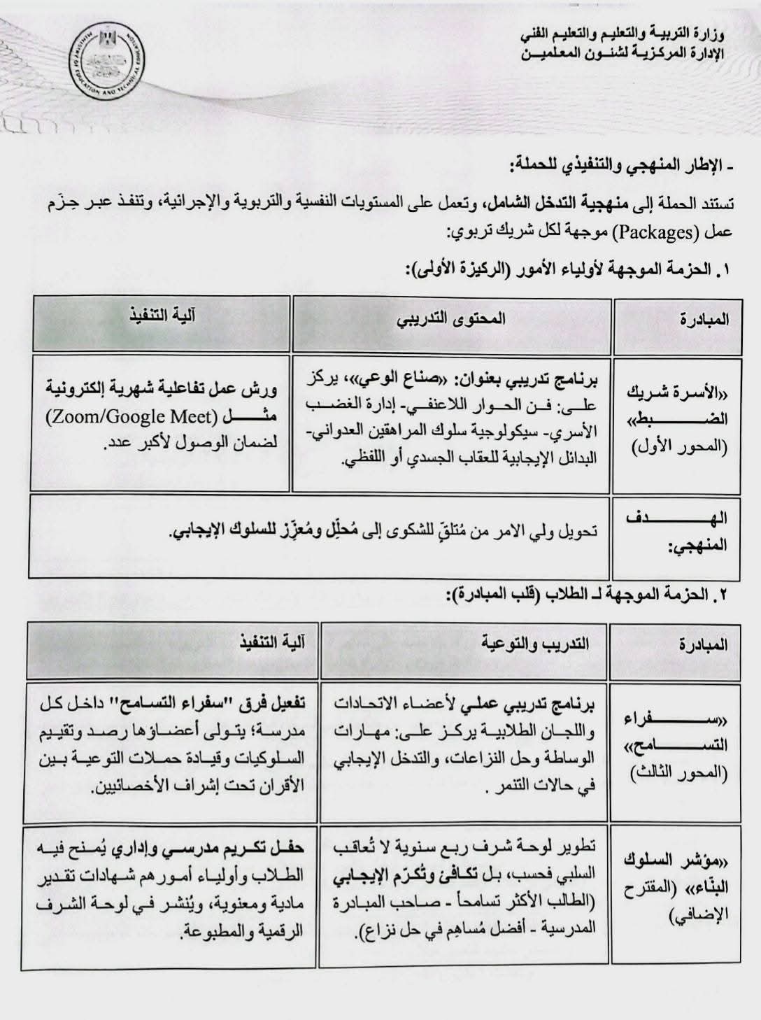 وتهدف الحملة إلى خلق بيئة مدرسية خالية من جميع أشكال العنف والتنمر، وتعزيز السلوكيات الإيجابية داخل المدارس، من خلال تفعيل الشراكة بين الأسرة والمعلم والقيادات التربوية، بما يحقق منظومة حماية متكاملة للطلاب.