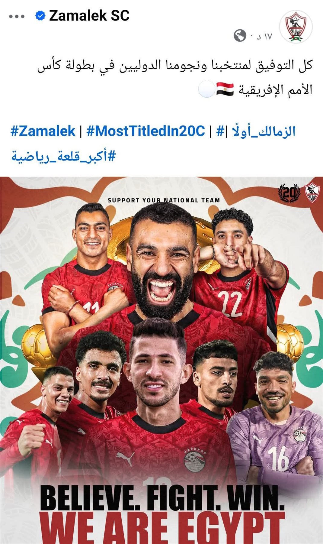 كما نشرت الصفحة الرسمية لنادي الزمالك صورة لمنتخب مصر، لدعمه قبل لقاء زيمبابوي فى بطولة كأس الأمم الأفريقية التى انطلقت أمس فى المغرب كتبت أعلاها كل التوفيق لمنتخبنا ونجومنا الدوليين حيث تضمنت صورة الخماسى الزمالكاوي، فى منتخب مصر أحمد فتوح ومحمد صبحي وحسام عبد المجيد ومحمد شحاتة ومحمد إسماعيل.