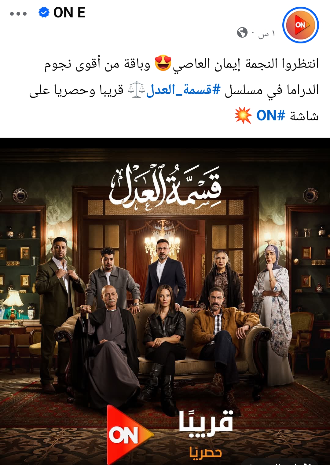 وكتبت تعليقا: "انتظروا النجمة إيمان العاصي وباقة من أقوى نجوم الدراما في مسلسل قسمة العدل، قريبا وحصريا على شاشة ON".