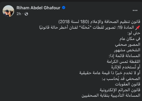 حرصت ريهام عبد الغفور على الدفاع عن حقها، ليس فقط إنسانيًا، بل قانونيًا أيضًا، حيث نشرت عبر حسابها الرسمي على فيسبوك توضيحًا قانونيًا استندت فيه إلى قانون تنظيم الصحافة والإعلام رقم 180 لسنة 2018، وتحديدًا المادة 19، مؤكدة أن تصوير لقطات "مُخلّة" لفنان يُعد من أخطر الحالات قانونيًا، حتى لو كان التصوير في مكان عام، أو المصور صحفيًا، أو الشخص المصوَّر شخصية عامة.