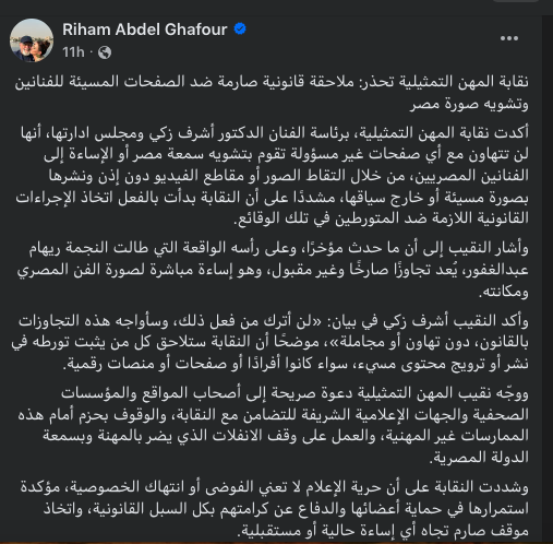 من جانبها، أصدرت نقابة المهن التمثيلية بيانًا شديد اللهجة، أكدت فيه أنها لن تتهاون مع أي صفحات أو أفراد يسيئون للفنانين أو يشوّهون صورة الفن المصري من خلال نشر صور أو مقاطع فيديو دون إذن أو خارج سياقها.