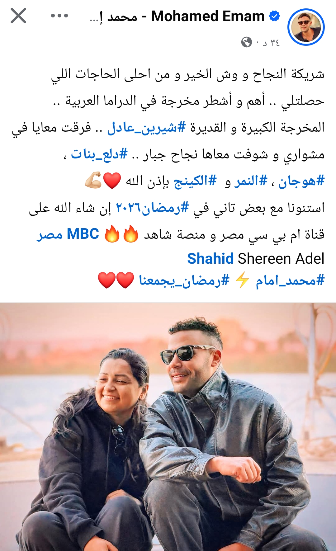 ونشر محمد إمام، صورة تجمعه بالمخرج شيرين عادل، عبر حسابه الشخصي بموقع التواصل الاجتماعي فيسبوك، وعلق قائلا: “شريكة النجاح ووش الخير ومن احلى الحاجات اللي حصلتلي.. أهم وأشطر مخرجة في الدراما العربية.. المخرجة الكبيرة والقديرة شيرين عادل”.