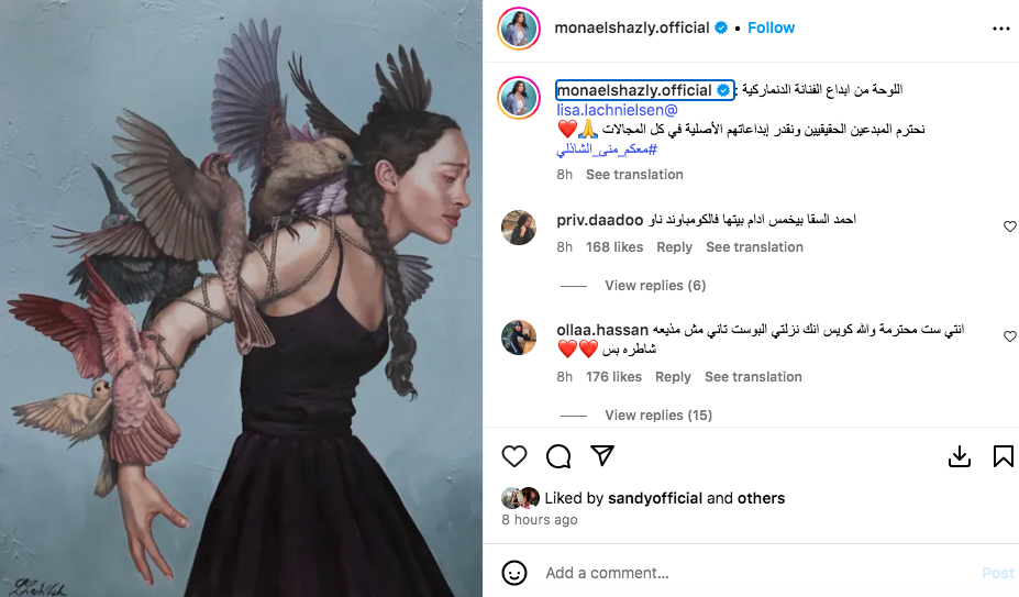 وأكدت منى الشاذلي الواقعة عبر حسابها الرسمي على "إنستجرام"، قائلة: "اللوحة من إبداع الفنانة الدنماركية @lisa.lachnielsen نحترم المبدعين الحقيقيين ونقدر إبداعاتهم الأصلية في كل المجالات".