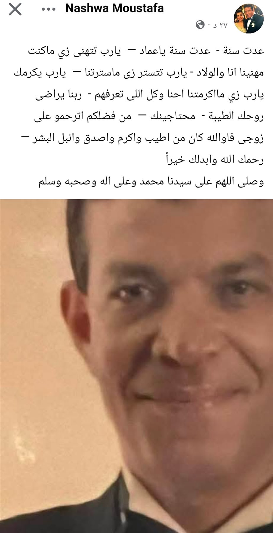 وكتبت نشوى مصطفى: "عدت سنة، عدت سنة يا عماد، يارب تتهنى زي ما كنت مهنينا أنا والولاد، يارب تتستر زى ماسترتنا، يارب يكرمك يارب زي ما أكرمتنا إحنا وكل اللى تعرفهم، ربنا يراضى روحك الطيبة".