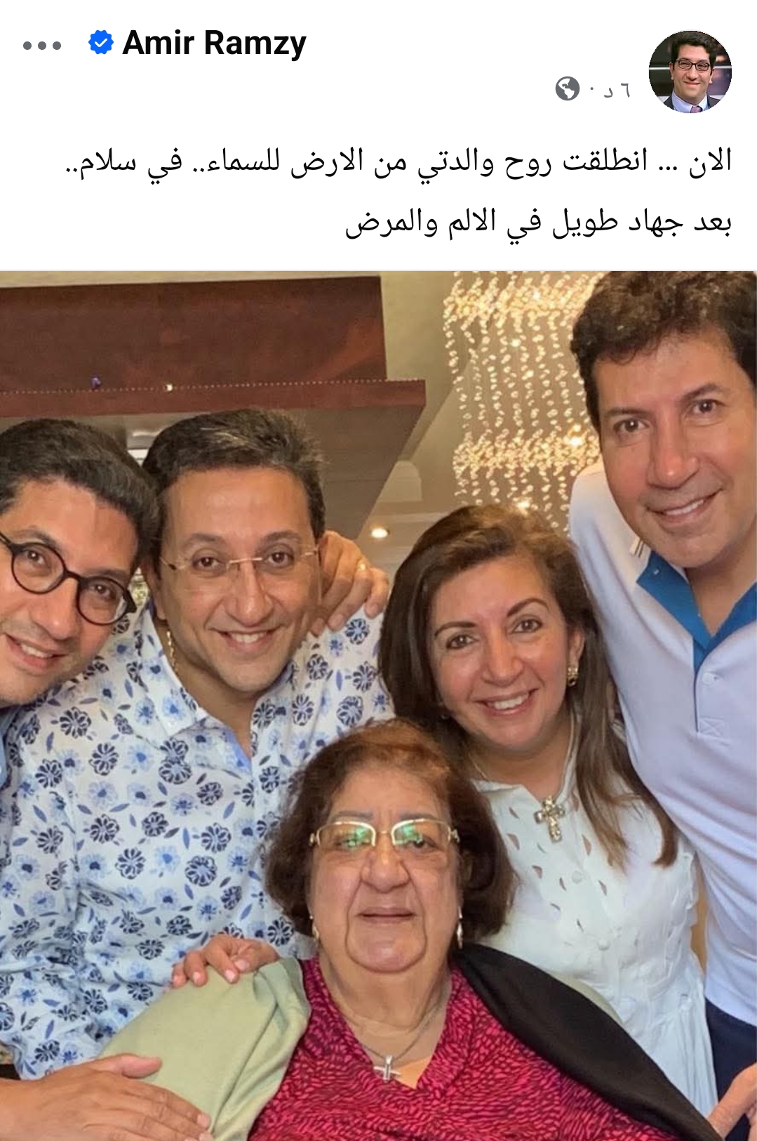 وعلق قائلا: “الآن … انطلقت روح والدتي من الأرض للسماء.. في سلام.. بعد جهاد طويل في الألم والمرض”.