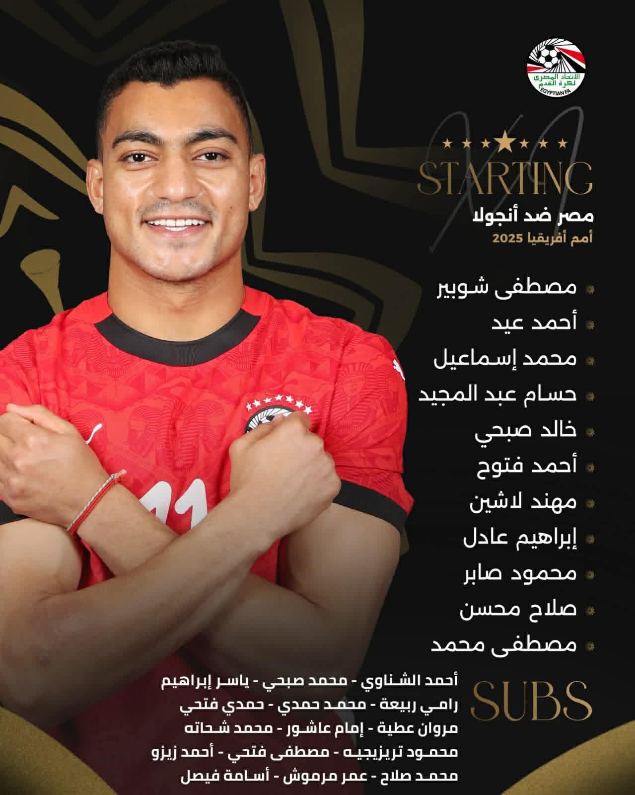 أعلن الجهاز الفني بقيادة حسام حسن،  لمنتخب مصر التشكيل الذي سيخوض به لقاء أنجولا فى الجولة الثالثة من دور المجموعات ببطولة كأس الأمم الأفريقية المقامة حاليا في المغرب.
