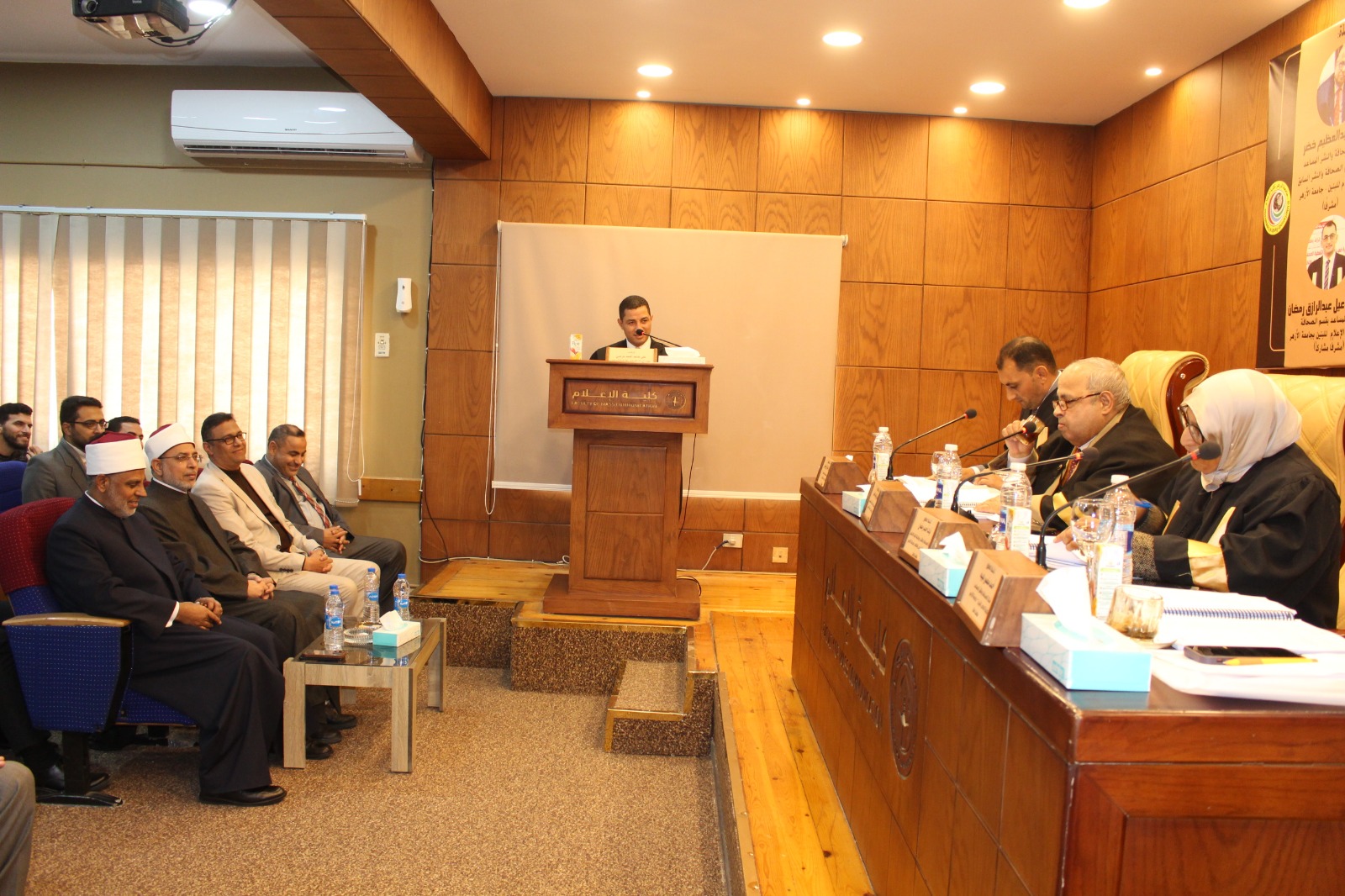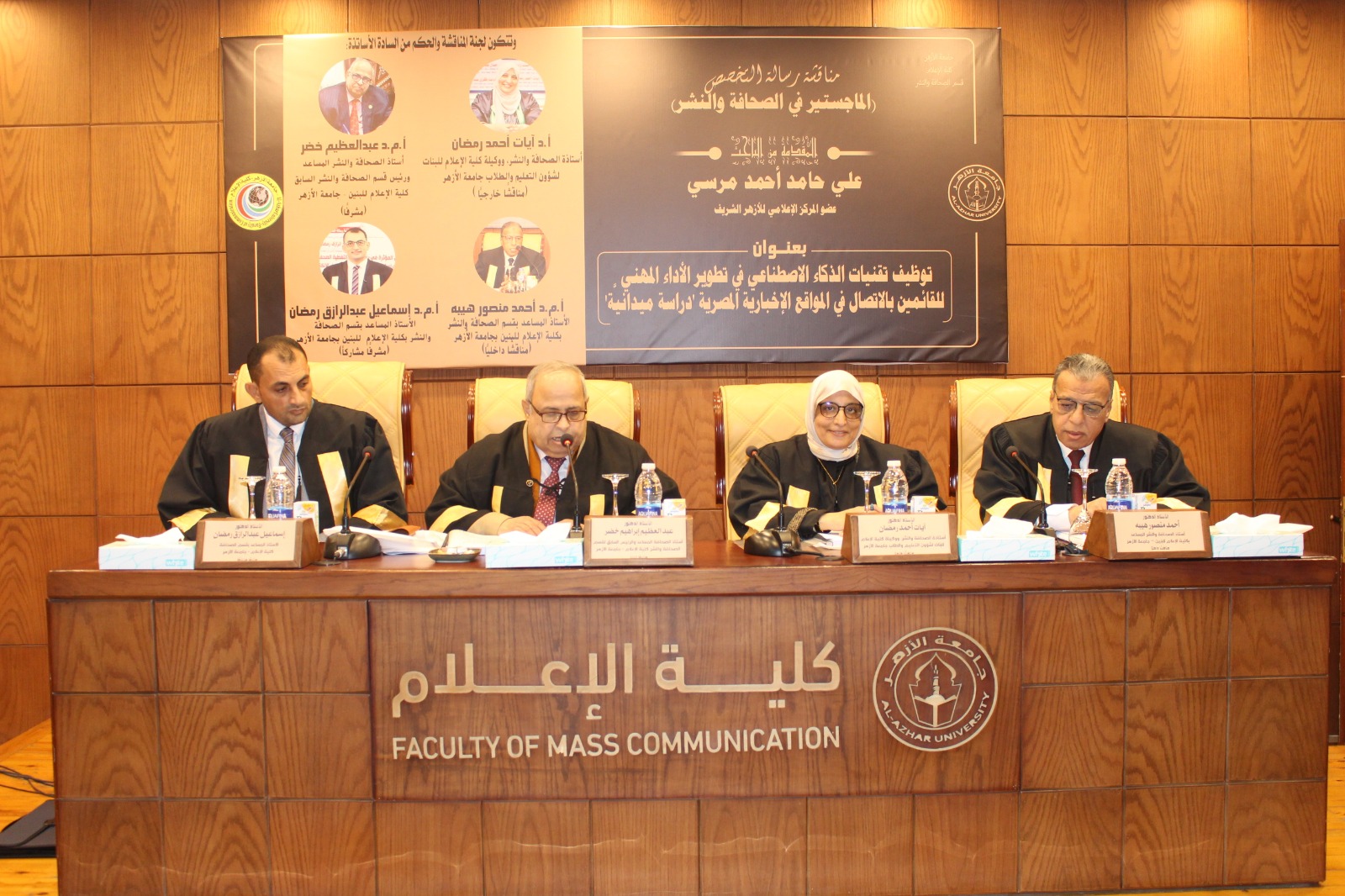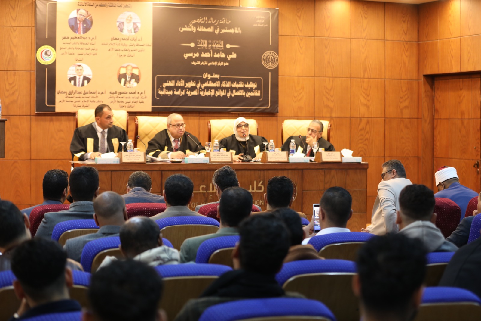 وأقيمت المناقشة بحضور كوكبة من قيادات الأزهر الشريف، وعلى رأسهم الأستاذ الدكتور سلامة داود رئيس جامعة الأزهر، والأستاذ الدكتور عباس شومان وكيل الأزهر الأسبق، والأستاذ الدكتور رضا عبد الواجد أمين عميد كلية الإعلام، والأستاذ الدكتور أحمد خليفة الشرقاوي وكيل قطاع المعاهد الأزهرية، والأستاذ الدكتور ولاء العقاد، عميدة كلية الإعلام للبنات بجامعة الأزهر، والدكتور أحمد بركات، مدير المركز الإعلامي للأزهر الشريف، ووكلاء وأساتذة كلية الإعلام بجامعة الأزهر.