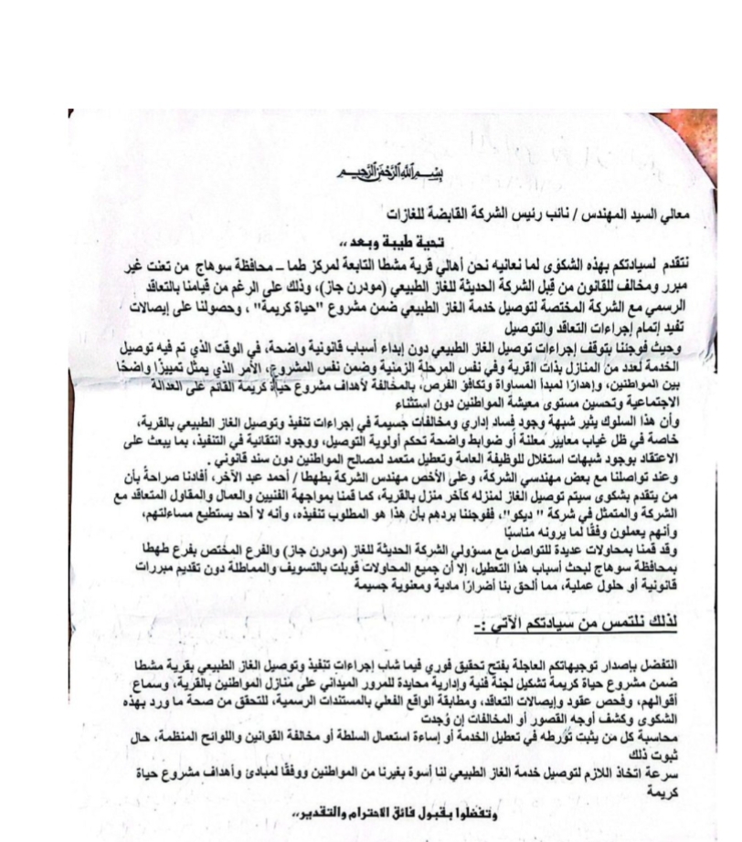 وتقدم عدد من أهالي القرية من بينهم محامون بشكوى رسمية إلى الجهات المختصة بمركز طما أشاروا فيها إلى وجود ملاحظات على أسلوب التنفيذ من جانب الشركة المنفذة مؤكدين أن توصيل الغاز يتم بصورة غير متوازنة حيث جرى إدراج بعض المنازل ضمن المشروع، مقابل استبعاد منازل أخرى رغم استيفائها الشروط الفنية دون توضيح الأسباب.