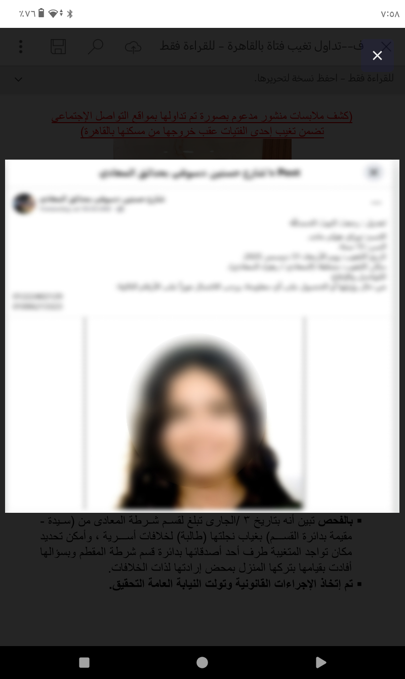 جاء ذلك في إطار جهود أجهزة وزارة الداخلية، لكشف ملابسات منشور مدعوم بصورة تم تداولها بمواقع التواصل الاجتماعي تضمن تغيب إحدى الطالبات عقب خروجها من مسكنها بالقاهرة.