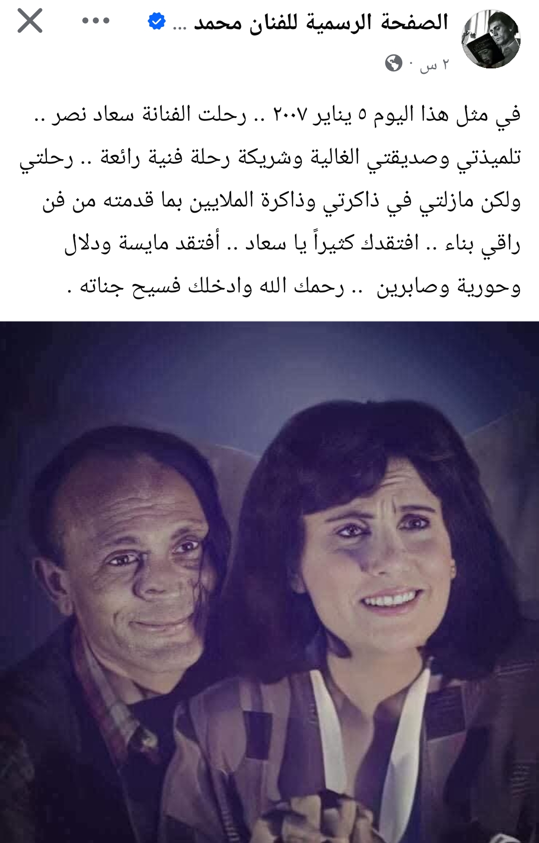 ونشر محمد صبحي، صورة تجمعه بالراحلة سعاد نصر، عبر حسابه الشخصي بموقع التواصل الاجتماعي فيسبوك، وعلق قائلا: “في مثل هذا اليوم 5 يناير 2007.. رحلت الفنانة سعاد نصر.. تلميذتي وصديقتي الغالية وشريكة رحلة فنية رائعة”.