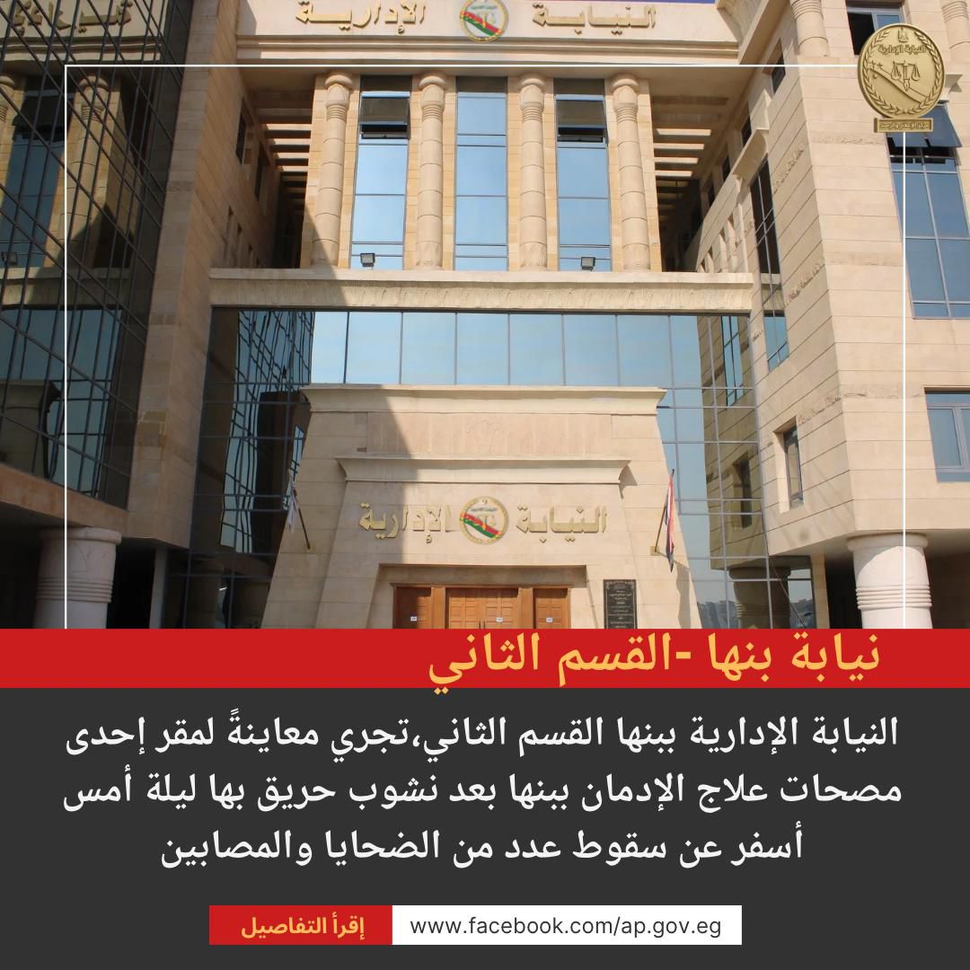 تابعت هيئة النيابة الإدارية حادث اندلاع حريق بأحد المراكز الصحية لعلاج الإدمان بمدينة بنها في القليوبية، الذي أسفر عن مصرع 7 من النزلاء وإصابة أربعة آخرين، ووقوع خسائر بالممتلكات وذلك تنفيذًا لتكليفات المستشار محمد الشناوي، رئيس هيئة النيابة الإدارية.