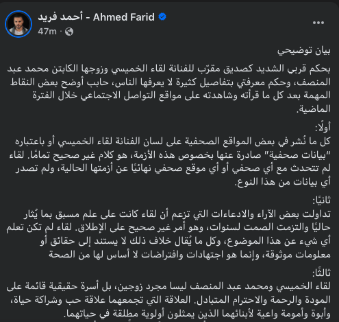 وفي دفاعه عن العلاقة بين لقاء الخميسي ومحمد عبد المنصف، قال أحمد فريد: "ثالثًا.. لقاء الخميسي ومحمد عبد المنصف ليسا مجرد زوجين، بل أسرة حقيقية قائمة على المودة والرحمة والاحترام المتبادل. العلاقة التي تجمعهما علاقة حب وشراكة حياة، وأبوة وأمومة واعية لأبنائهما الذين يمثلون أولوية مطلقة في حياتهما، محمد عبد المنصف إنسان قبل أن يكون اسمًا معروفًا، زوج وأب حريص على بيته وأولاده، ومتحمل لمسئولياته، وله رصيد طويل من العطاء والالتزام داخل أسرته، من يعرف محمد عن قرب يدرك جيدًا معدنه الحقيقي، ويدرك أن أي إنسان قد يمر بلحظات ضعف أو أخطاء، لكن ما يُحسب له هو تحمّله للمسئولية، ورغبته الصادقة في الإصلاح والحفاظ على بيته وأسرته".