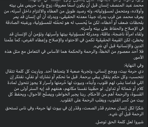 كما أشار إلى حكمة لقاء الخميسي ونضجها قائلًا: "ولقاء امرأة ناضجة، عاقلة، ومدركة لمسئولية بيتها وأسرتها، وتؤمن أن الإنسان قد يخطئ، لكن القيمة الحقيقية تكمن في الاحتواء والإصلاح وإعطاء الفرص، كما علّمنا الدين والإنسانية قبل أي شيء. وكما قال رسول الله ﷺ: «كل بني آدم خطّاء، وخير الخطّائين التوّابون»، فلا أحد معصوم من الخطأ، والرحمة والحكمة هما الأساس في التعامل مع مثل هذه الأمور، وفي النهاية: دي حرمة بيت، ووجع إنساني، وتجربة صعبة لا يتمناها أحد".
