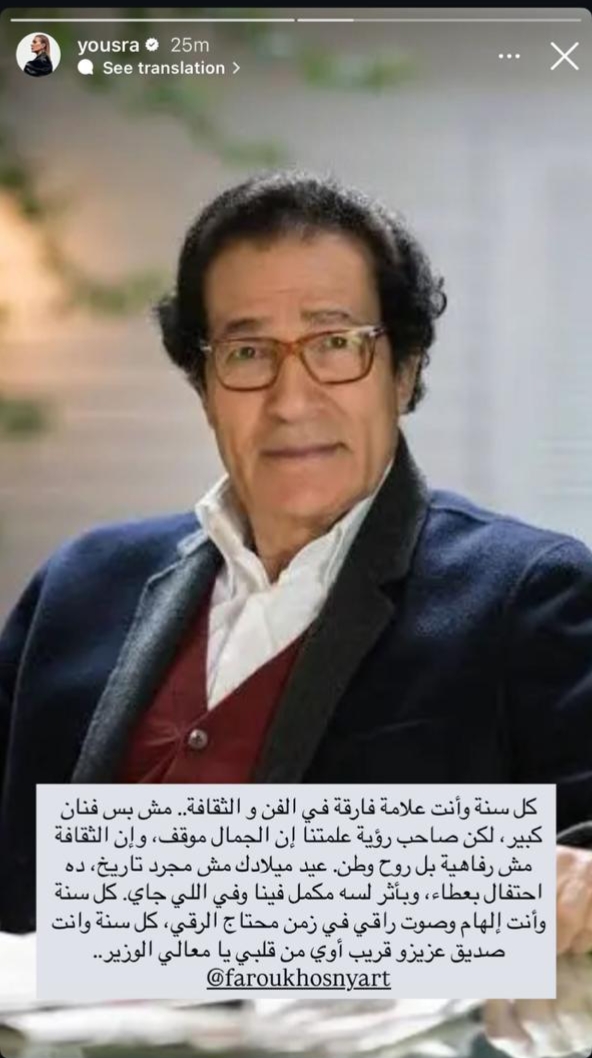 احتفلت الفنانة يسرا بذكرى ميلاد وزير الثقافة الأسبق فاروق حسني موجهة له رسالة تقدير وإجلال أعربت فيها عن مكانته المرموقة في المجالات الفنية والثقافية.