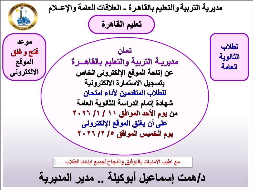 أعلنت مديرية التربية والتعليم بالقاهرة إتاحة الموقع الإلكتروني الخاص بتسجيل الاستمارة الإلكترونية للطلاب المتقدمين لأداء امتحان شهادة إتمام الدراسة الثانوية العامة، وذلك اعتبارًا من يوم الأحد الموافق 11/1/2026.