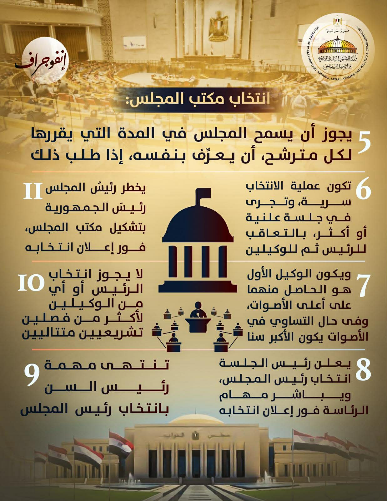 كما تضمنت الإنفوجرافات إجراءات انتخاب مكتب المجلس، حيث يُنتخب الرئيس والوكيلان في أول اجتماع لدور الانعقاد السنوي، بالأغلبية المطلقة، وتكون عملية الانتخاب سرية، مع تحديد الوكيل الأول بناءً على أعلى الأصوات، ويخطر رئيس المجلس رئيس الجمهورية فور إعلان تشكيل المكتب.