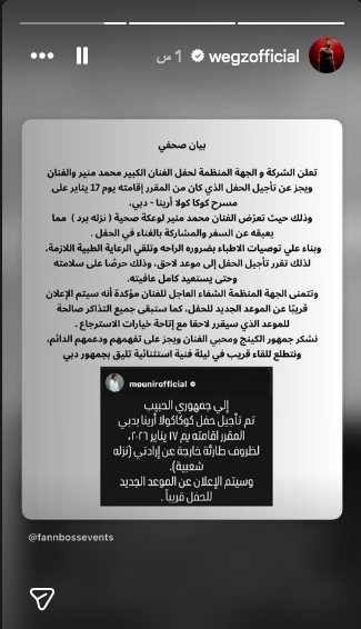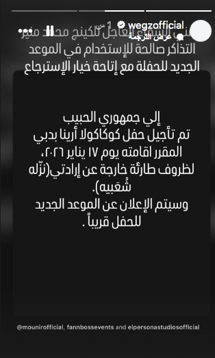 وكتب ويجز عبر خاصية الاستوري على حسابه الرسمي بموقع إنستجرام: «نتمنى الشفاء العاجل للكينج محمد منير، التذاكر صالحة للاستخدام في الموعد الجديد للحفل مع إتاحة خيار الاسترجاع».