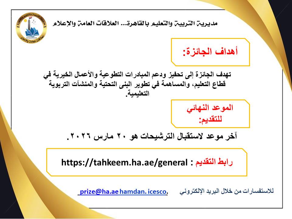 وأكدت المديرية أن الجائزة تُعد من المبادرات الدولية الرائدة، وتأتي نتاج تعاون مثمر بين منظمة العالم الإسلامي للتربية والعلوم والثقافة (الإيسيسكو) ومؤسسة حمدان بن راشد آل مكتوم للعلوم الطبية والتربوية، بما يسهم في دعم جهود تطوير التعليم في الدول الإسلامية وتعزيز مفاهيم التنمية المستدامة.