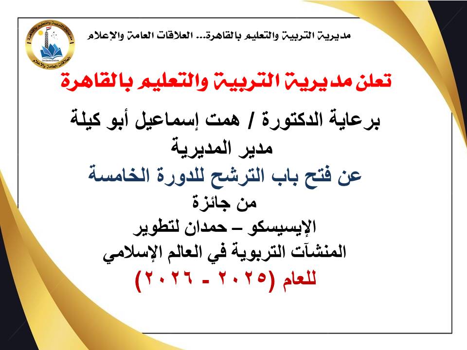 أعلنت مديرية التربية والتعليم بالقاهرة، تحت رعاية الدكتورة همت أبو كيلة مدير المديرية، فتح باب الترشح للدورة الخامسة (2025–2026) من جائزة الإيسيسكو حمدان لتطوير المنشآت التربوية في العالم الإسلامي، وذلك في إطار دعم المبادرات الرامية إلى الارتقاء بالبنية التحتية التعليمية وتحسين جودة العملية التعليمية.