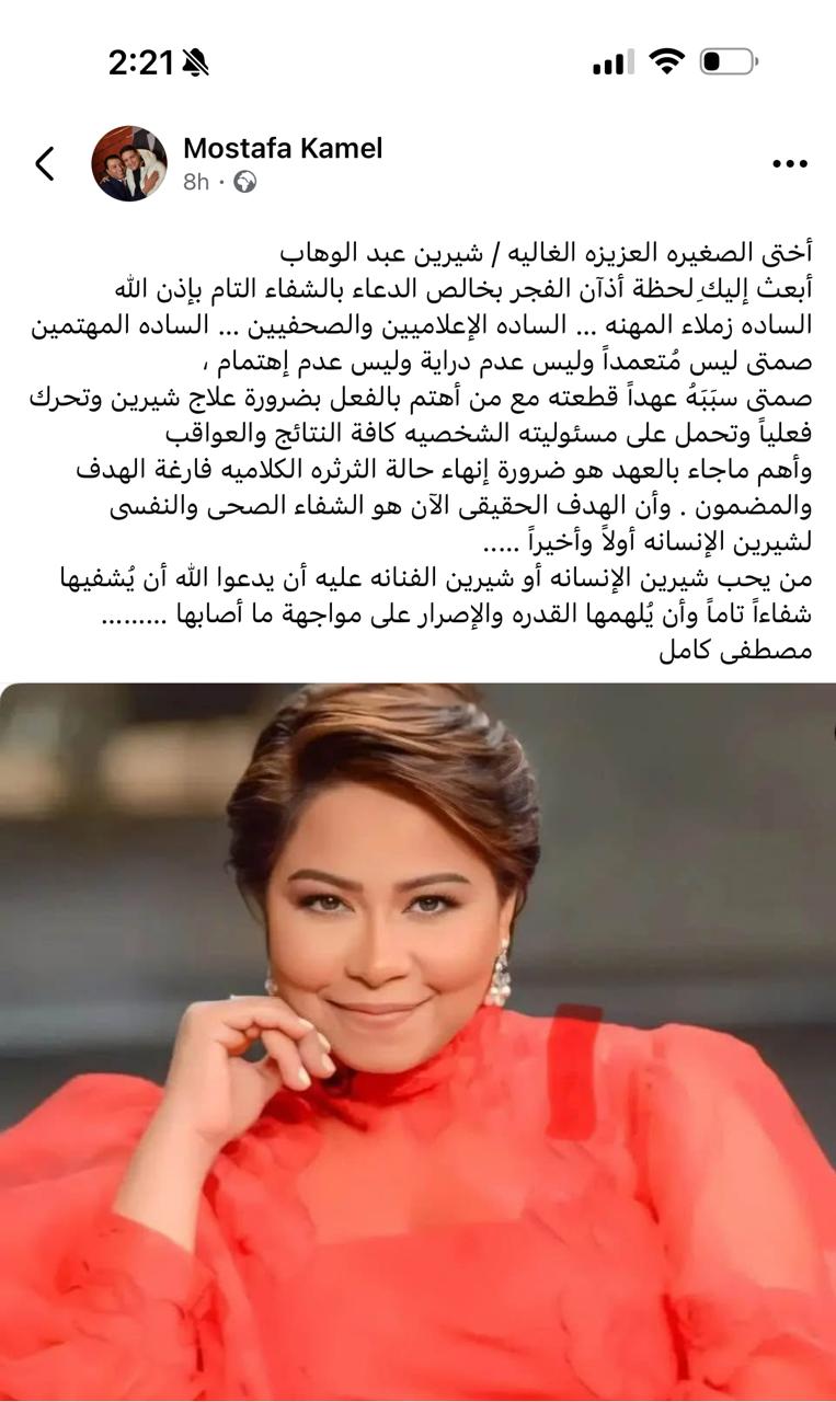 وجه النجم مصطفى كامل، نقيب المهن الموسيقية، رسالة دعم إلى النجمة شيرين عبد الوهاب، عقب الأزمة الأخيرة التي مرت بها، مؤكدًا أن الشفاء الصحي والنفسي هو الهدف الأهم في المرحلة الحالية.