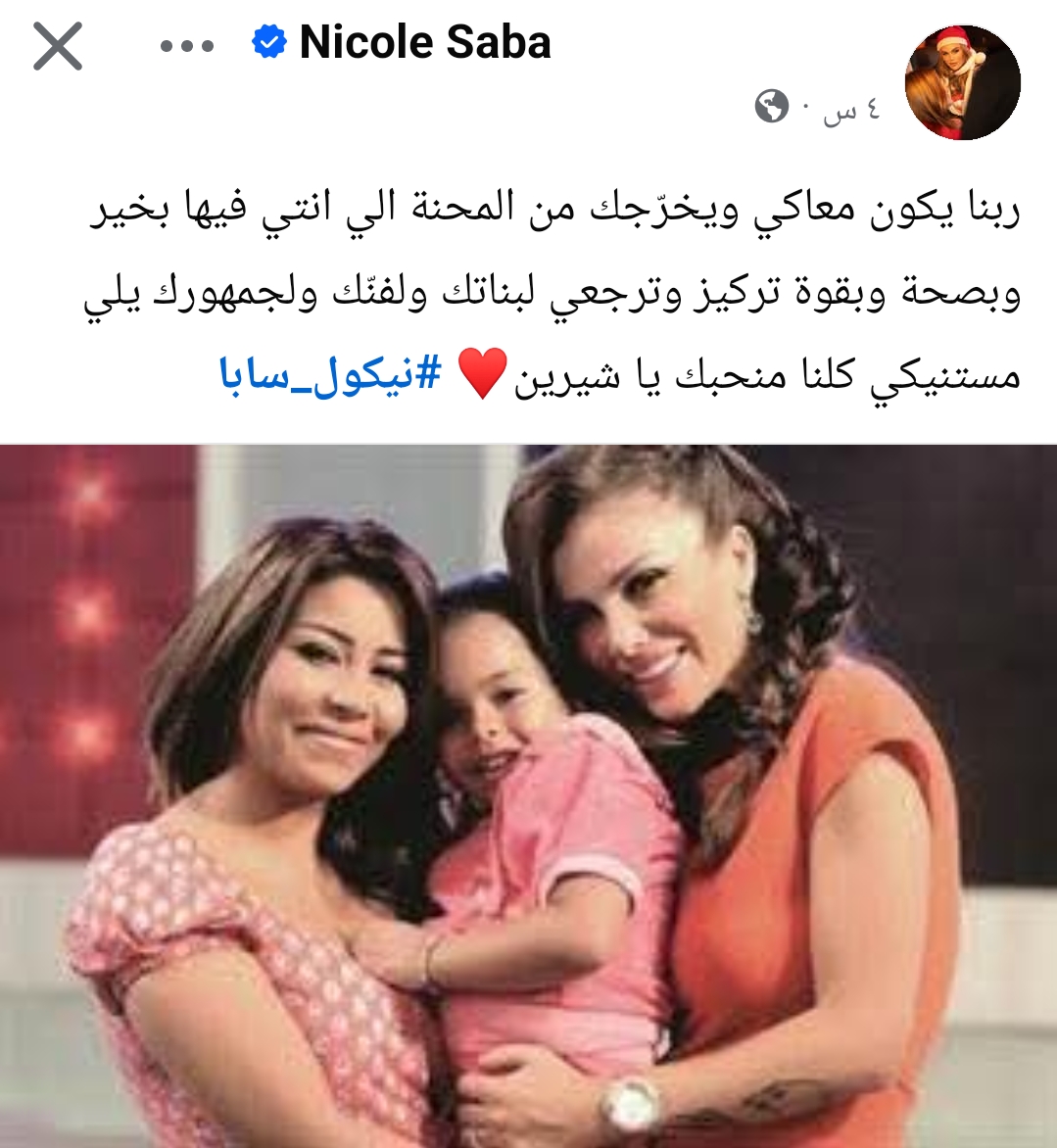 ونشرت نيكول سابا، صورة تجمعها لشيرين وابنتها، وذلك عبر حسابها الشخصي بموقع التواصل الاجتماعي فيسبوك.