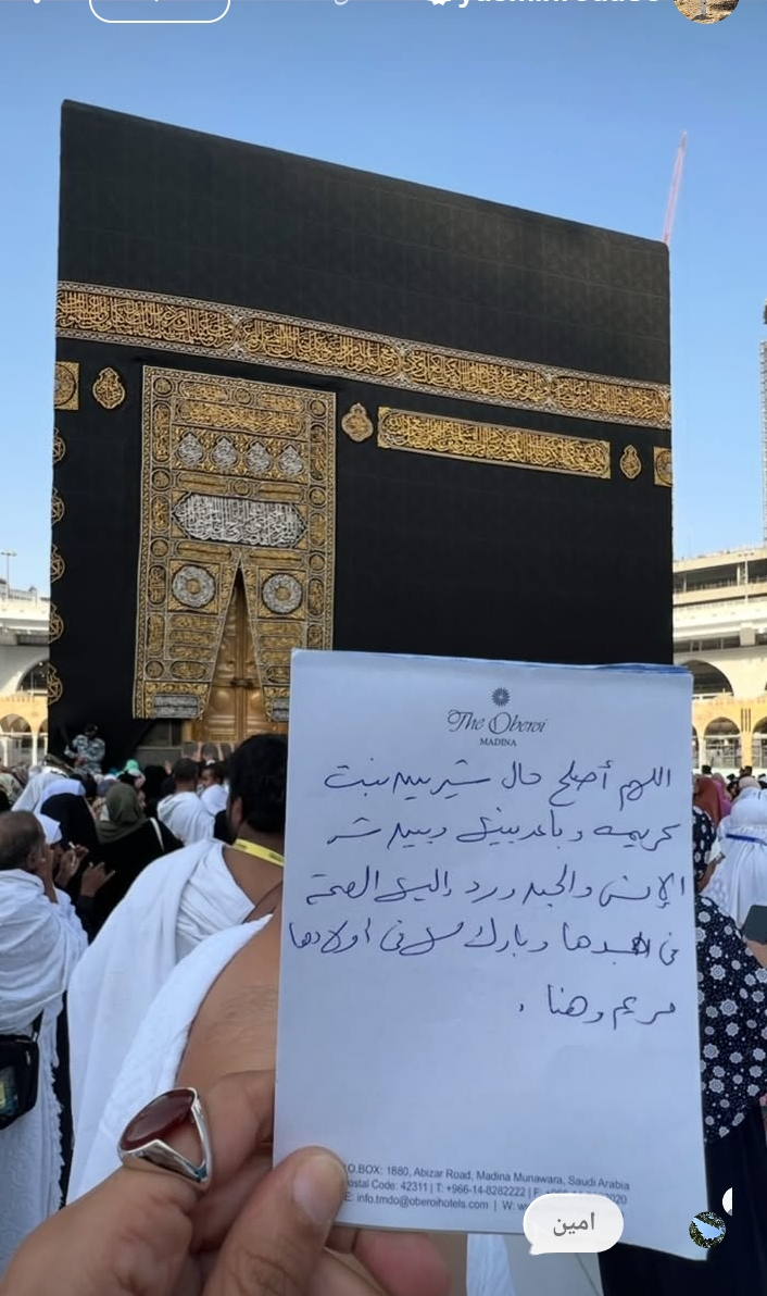 شاركت ياسمين رضا شقيقة الفنانة زينة، متابعيها  دعاء للفنانة شيرين عبد الوهاب من أمام الكعبة المشرفة، بعد أزمتها الصحية الأخيرة متمنية لها الصحة والعافية.