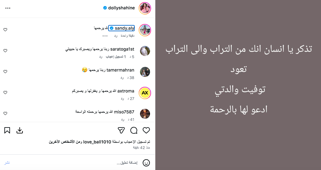 أعلنت الفنانة دوللي شاهين منذ قليل وفاة والدتها، وذلك عبر حسابها الرسمي على موقع «إنستجرام»، حيث نشرت رسالة مؤثرة عبّرت فيها عن حزنها العميق، قائلة: «تذكّر يا إنسان أنك من التراب وإلى التراب تعود»، داعية الله أن يتغمد والدتها بواسع رحمته ويسكنها فسيح جناته.