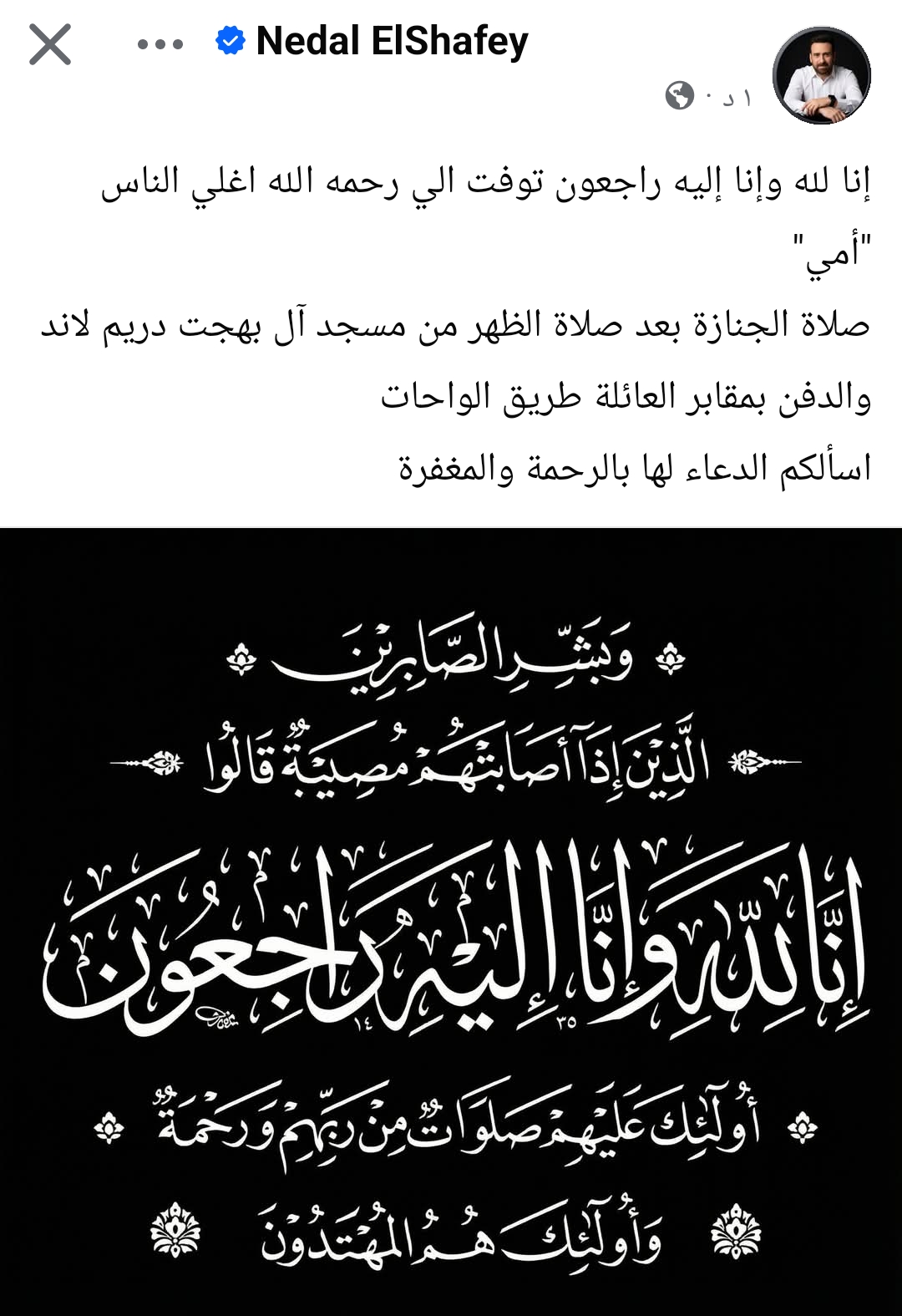 وكتب نضال الشافعي، عبر حسابه الشخصي بموقع التواصل الاجتماعي فيسبوك: "إنا لله وإنا إليه راجعون توفت إلى رحمه الله اغلي الناس أمي".