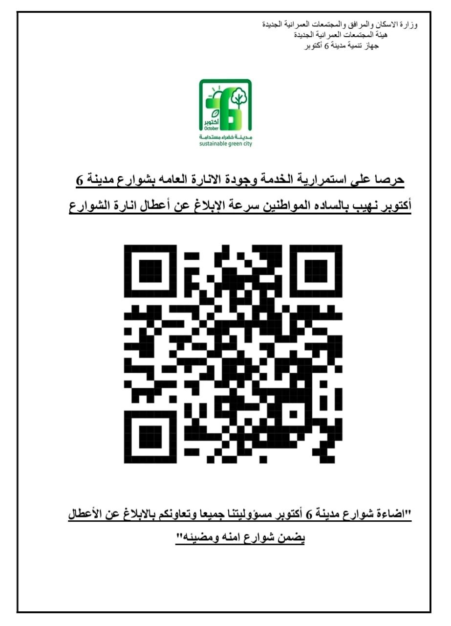 أعلن المهندس محمد عادل، رئيس جهاز مدينة ٦ أكتوبر، عن إطلاق خدمة "بلغ ونور"، والتي تتيح لسكان المدينة الإبلاغ عن أعطال الإنارة فورًا عبر مسح رمز الاستجابة السريع (QR Code)، وذلك في إطار خطة المدينة للتحول الرقمي وتيسير التواصل مع الجمهور.