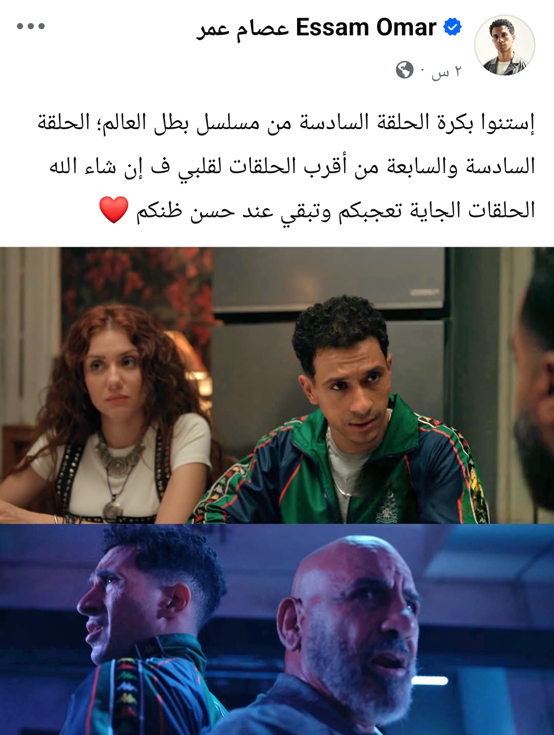 وكتب عصام عمر: "إستنوا بكرة الحلقة السادسة من مسلسل بطل العالم، الحلقة السادسة والسابعة من أقرب الحلقات لقلبي ف إن شاء الله الحلقات الجاية تعجبكم وتبقي عند حسن ظنكم".