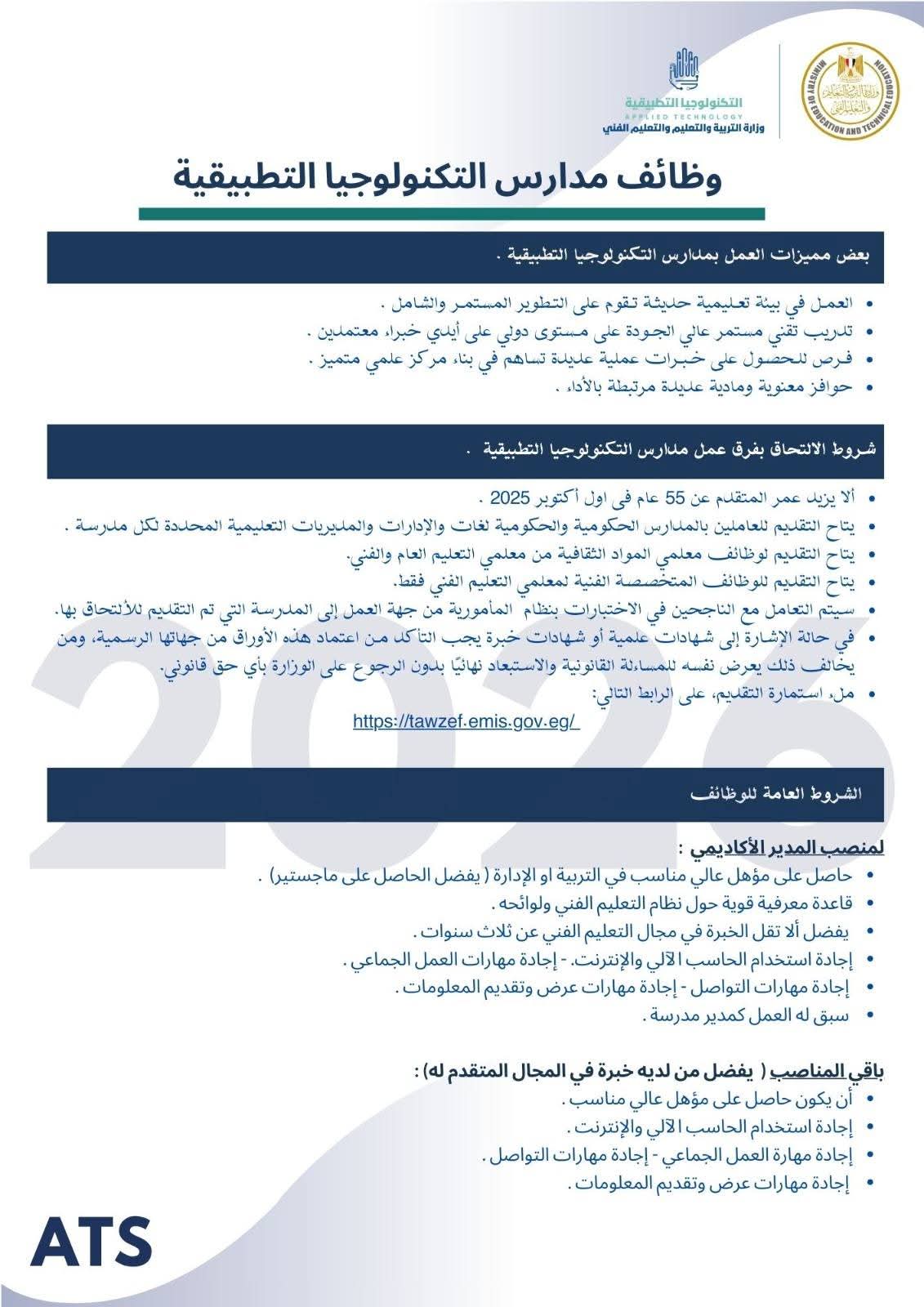 وتحرص وحدة تشغيل وإدارة مدارس التكنولوجيا التطبيقية أن يكون التقديم يستهدف اختيار عناصر بشرية متميزة قادرة على العمل في بيئة تعليمية حديثة تعتمد على التطوير المستمر والتدريب التقني عالي الجودة، تحت إشراف نخبة من الخبراء المعتمدين.